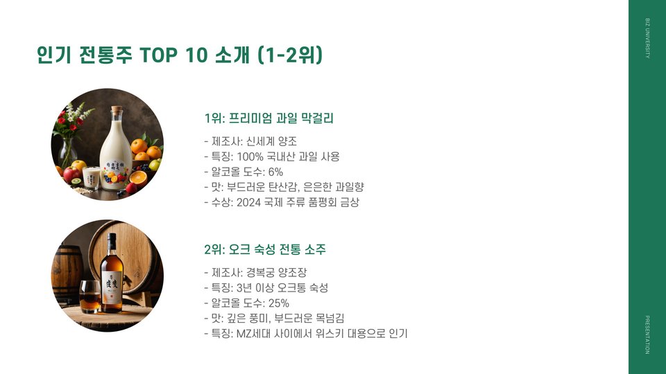 2025년에는 다양한 전통주가 소비자들 사이에서 인기를 끌고 있습니다. 특히, 지역 특성을 살린 전통주가 더욱 주목받고 있으며, 다음과 같은 주들이 TOP 10에 선정되었습니다: