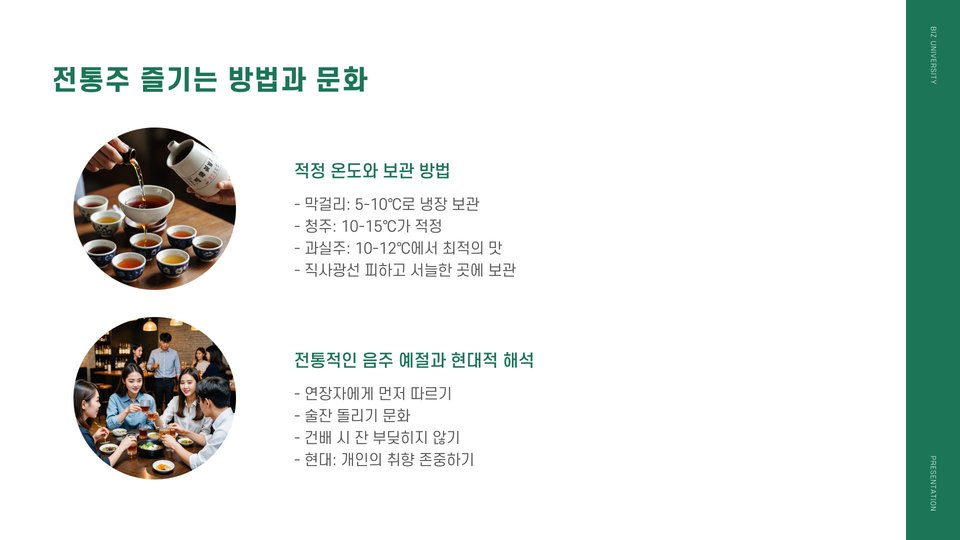 결론적으로, 전통주는 그 깊은 역사와 문화를 체험할 수 있는 매력적인 음료입니다. 이 가이드를 참고하여 당신에게 잘 어울리는 전통주를 선택하고, 즐거운 경험을 하시기 바랍니다. 전통주를 통해 소중한 순간을 만끽하시고, 그 속에서 진정한 한국의 매력을 느껴보시기 바랍니다.