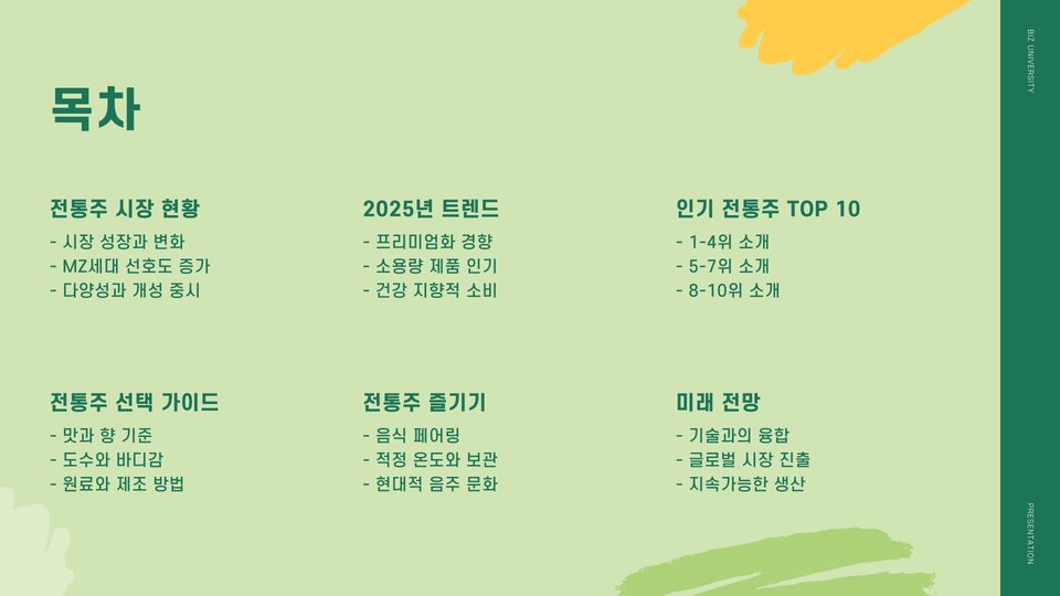 2025년 전통주 시장은 다양한 트렌드와 소비자들의 요구에 따라 끊임없이 변화하고 있습니다. 각 전통주는 그 자체로 매력이 있으며, 새로운 맛과 경험을 제공하고 있습니다. 소비자들이 선호하는 전통주를 선택하는 데 도움이 되는 이 가이드가 많은 분들에게 유익했기를 바랍니다. 앞으로의 전통주 시장이 더욱 흥미롭게 발전하기를 기대합니다.