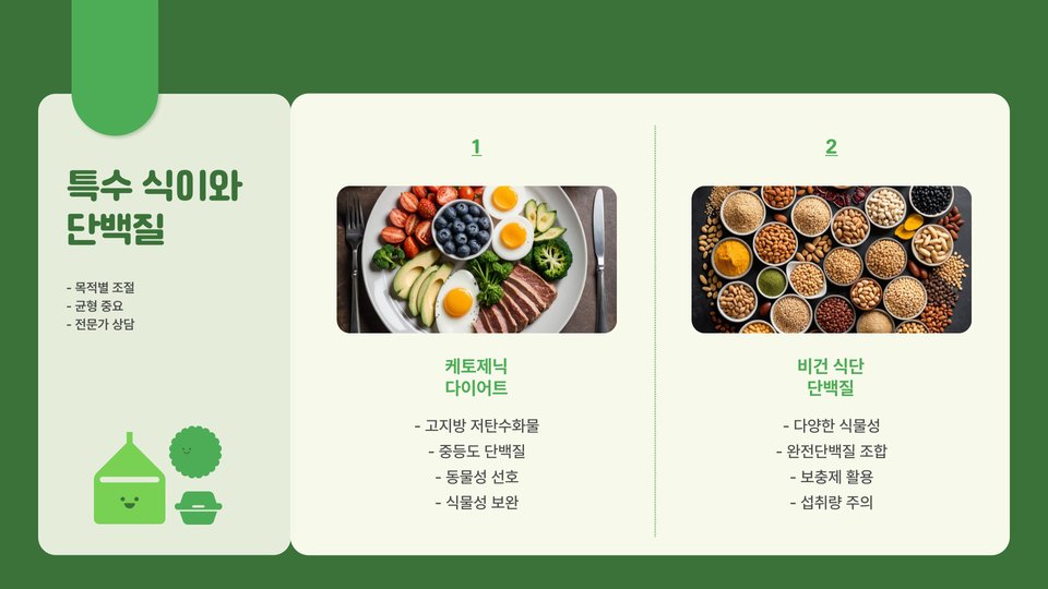 - 단백질은 동물성과 식물성으로 나누어져 있으며, 균형 잡힌 식사가 필요하다.