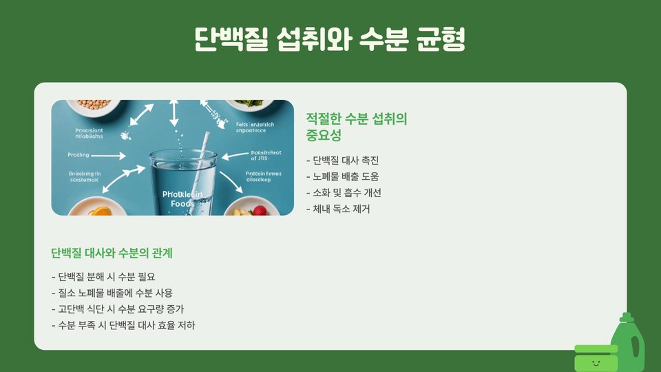 셋째, 수분 섭취 또한 중요합니다. 충분한 수분을 섭취하는 것은 단백질의 흡수를 돕고, 전반적인 건강에 긍정적인 효과를 미칩니다.