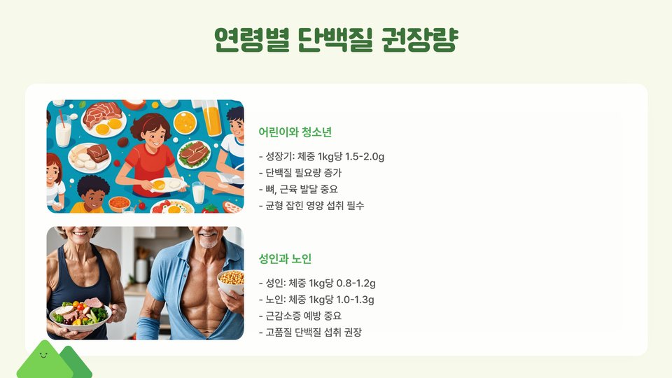 어린이 및 청소년은 성장과 발달에 필요하기 때문에 더 많은 단백질이 요구됩니다. 예를 들어, 1-3세 어린이는 하루에 약 13g, 4-8세는 약 19g, 9-13세 남자아이는 약 34g의 단백질 섭취가 권장됩니다. 또한, 여성과 남성의 경우 19세 이상일 때, 각각 46g과 56g의 단백질을 섭취하는 것이 이상적입니다.