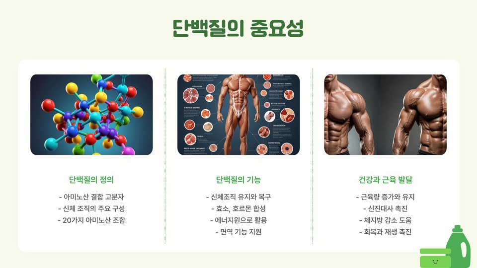단백질은 우리 몸의 세포를 구성하는 기본 성분으로, 근육, 피부, 머리카락, 그리고 모든 조직에서 발견됩니다. 단백질은 단순한 영양소 이상의 존재로, 신진대사를 조절하고, 호르몬과 효소를 생성하는 데 필수적입니다. 예를 들어, 우리 몸의 면역 반응을 돕는 항체도 단백질로 구성되어 있습니다. 이러한 중요한 기능 때문에 단백질의 섭취는 필수적입니다.