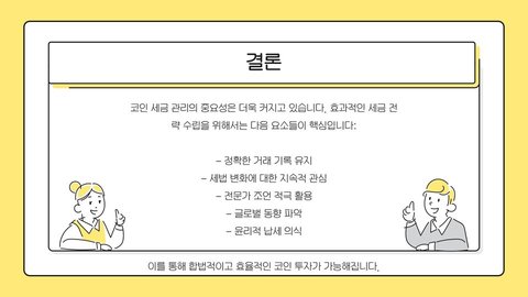 코인 세금은 복잡한 문제이지만, 올바른 정보와 전략을 통해 효과적으로 관리할 수 있습니다. 투자자들은 자신의 거래 내역을 면밀히 분석하고, 세법을 숙지하여 올바른 신고를 해야 합니다. 손실을 활용한 절세 전략과 장기 투자 방식이 특히 효과적인 방법으로 꼽힙니다. 앞으로도 코인 세금 관련 정책 변화에 주의하며, 현명한 투자를 이어가길 바랍니다.