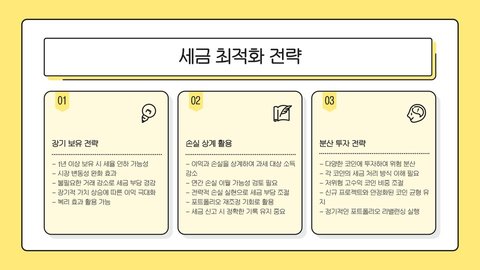 - 장기 투자와 손실 처리를 통해 세금 절세 전략을 세울 수 있다.