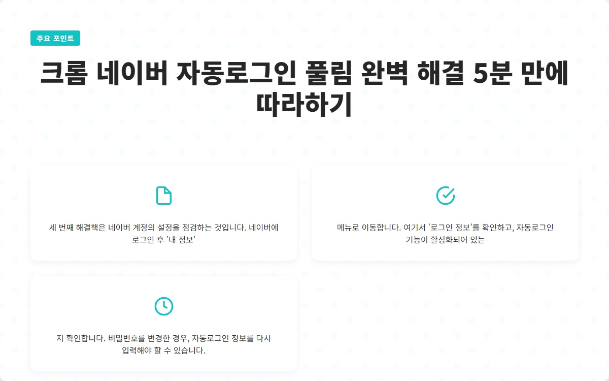 세 번째 해결책은 네이버 계정의 설정을 점검하는 것입니다. 네이버에 로그인 후 '내 정보' 메뉴로 이동합니다. 여기서 '로그인 정보'를 확인하고, 자동로그인 기능이 활성화되어 있는지 확인합니다. 비밀번호를 변경한 경우, 자동로그인 정보를 다시 입력해야 할 수 있습니다.