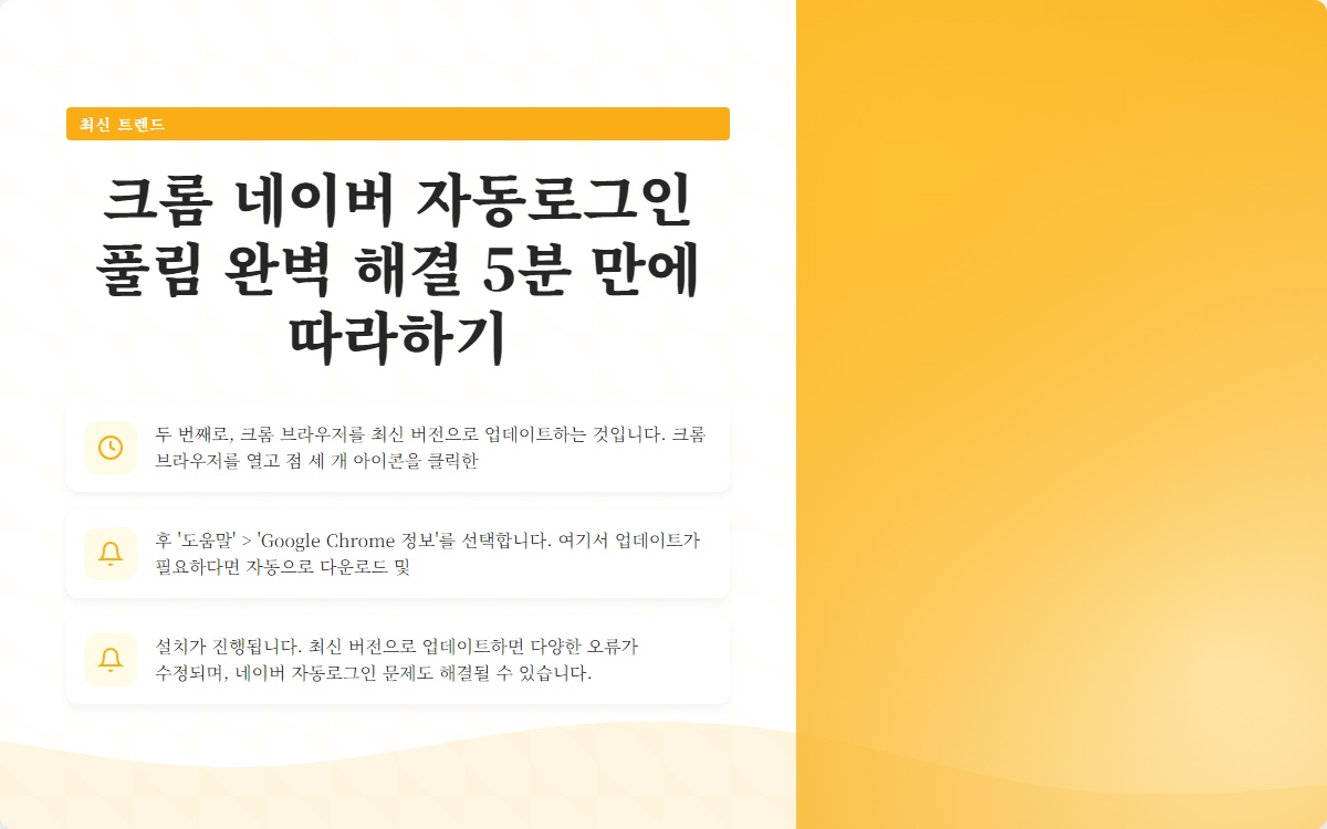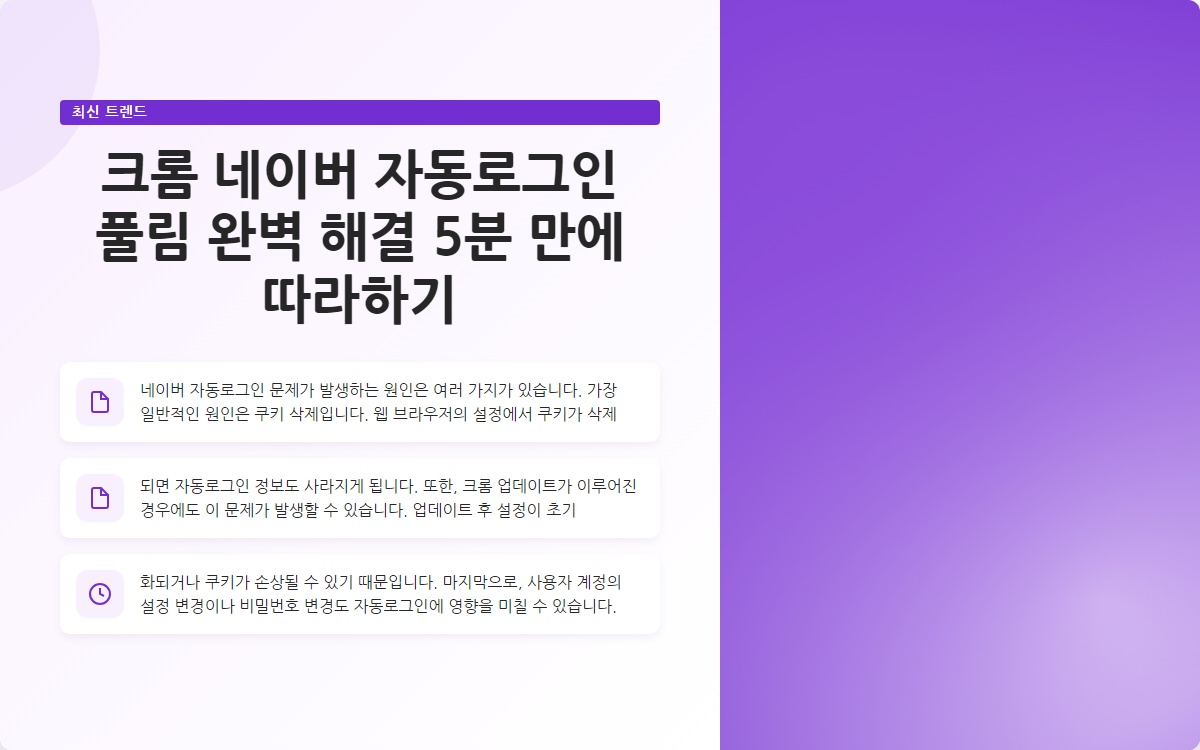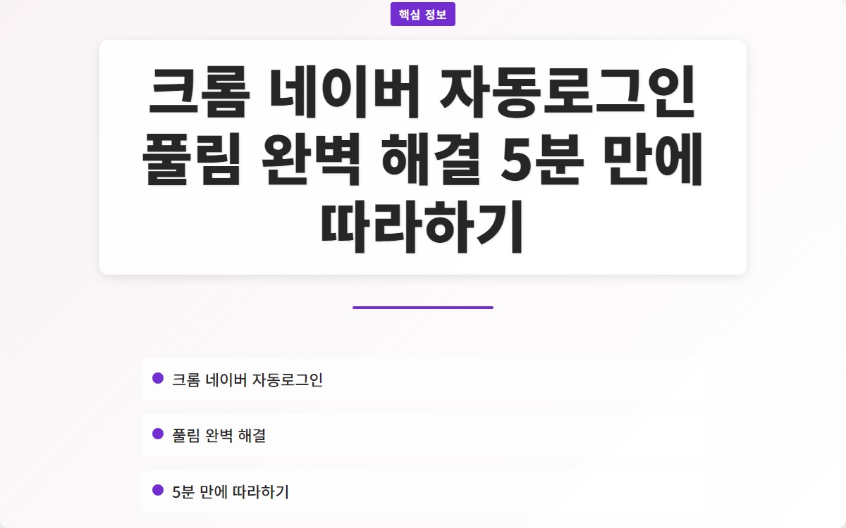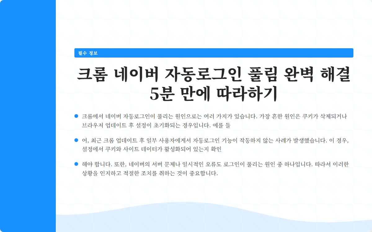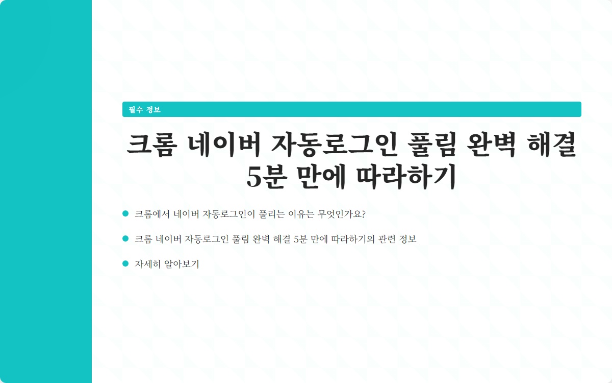 안녕하세요! 오늘은 크롬에서 네이버 자동로그인이 풀리는 문제를 완벽하게 해결하는 방법을 소개하겠습니다. 이 문제는 많은 사용자들이 겪는 어려움 중 하나인데요, 간단한 방법으로 5분 안에 해결할 수 있습니다. 이제부터 문제의 원인과 해결책을 단계별로 알아보겠습니다.