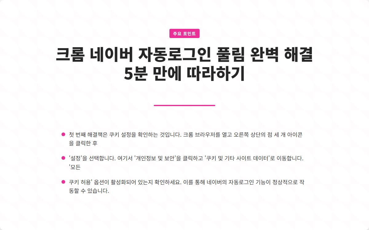 A1: 쿠키 설정을 확인하고, 크롬 업데이트를 진행한 후 네이버 계정의 설정을 점검하세요.