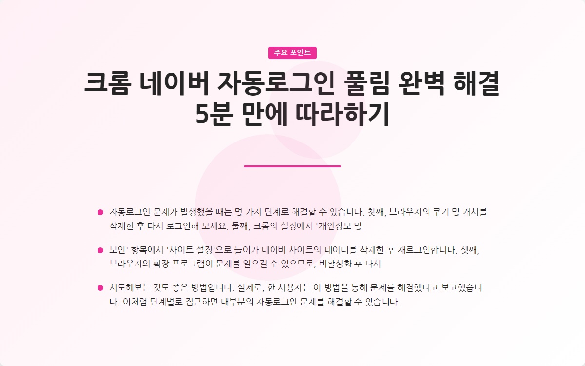 이렇게 크롬 네이버 자동로그인 문제를 해결하는 방법을 알아보았습니다. 간단한 단계만으로도 문제를 해결할 수 있으니, 꼭 따라 해보세요!