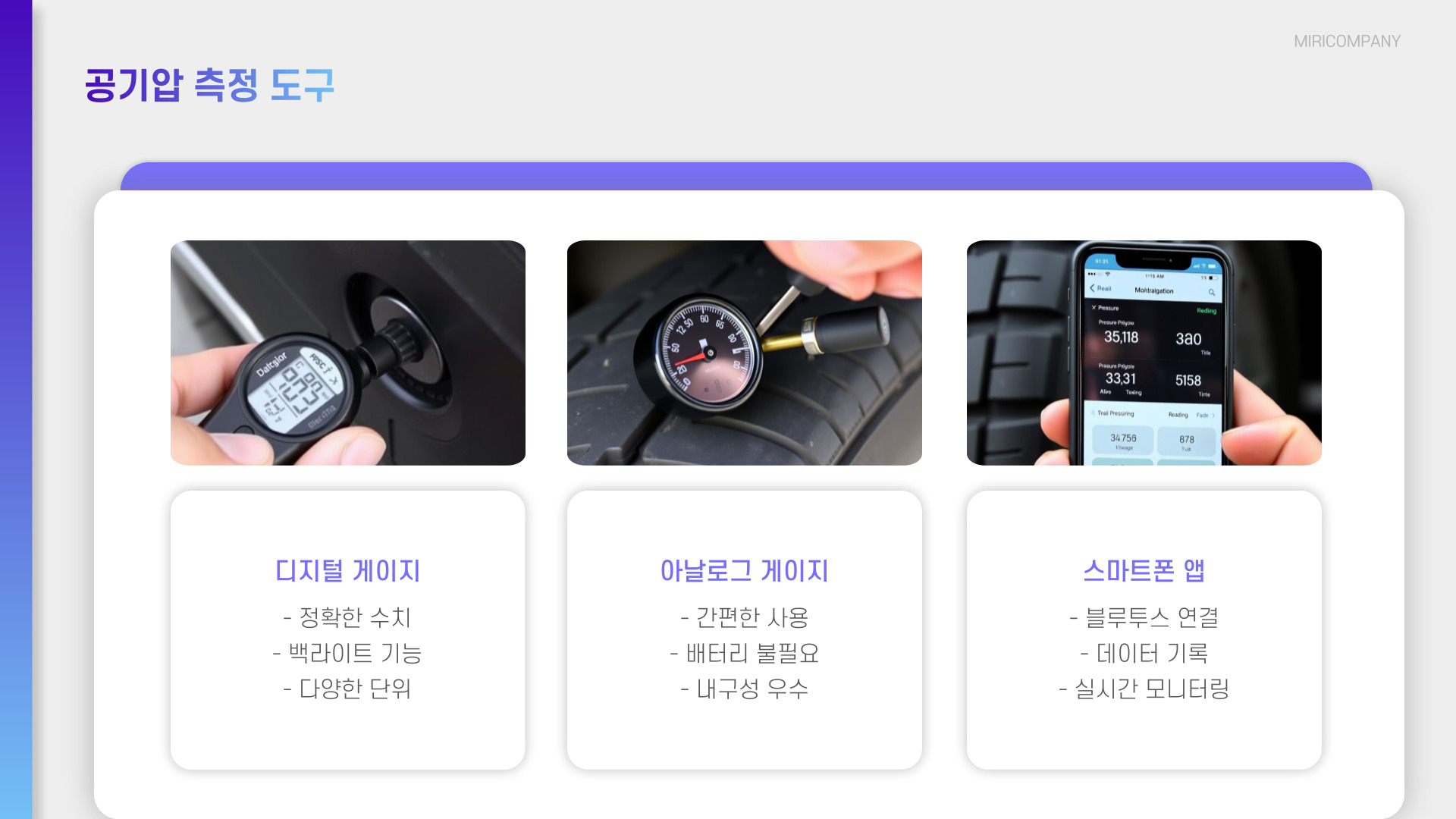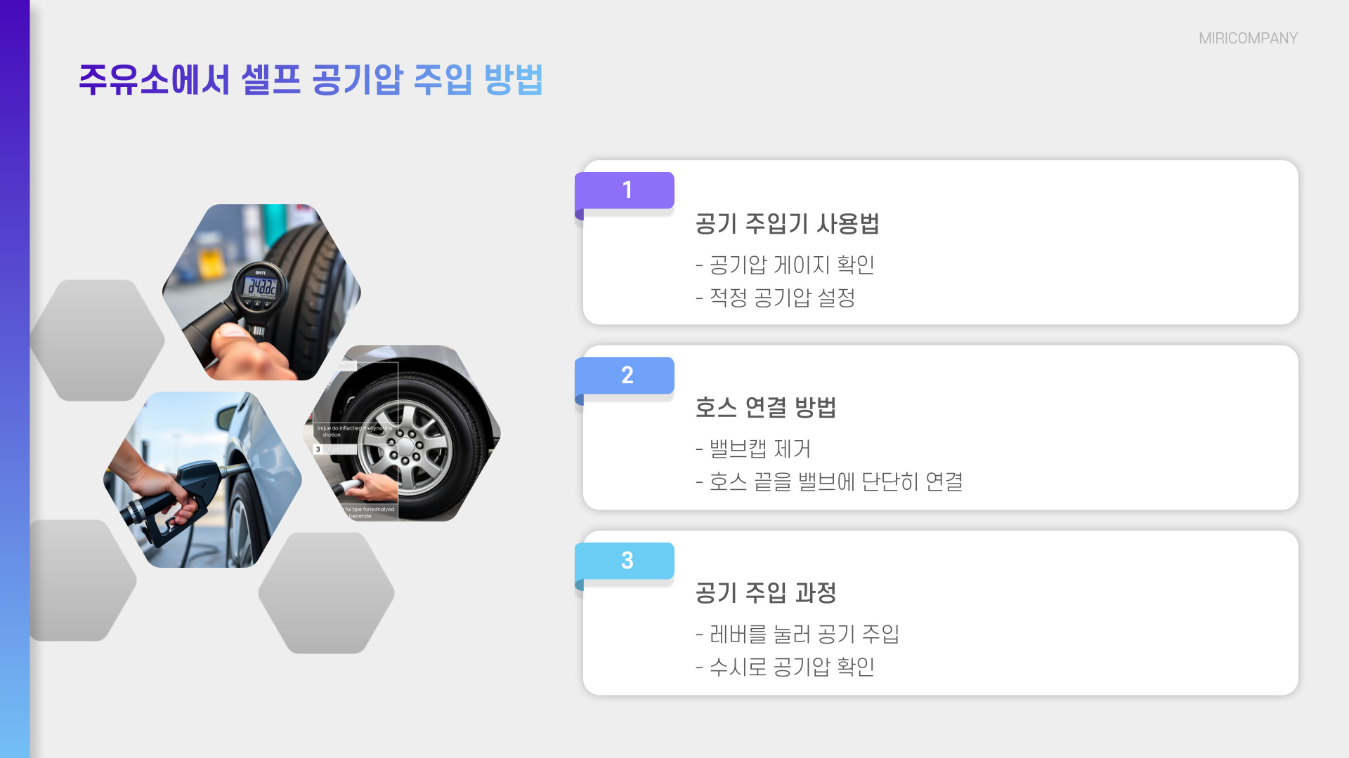 • 주유소, 자동차 정비소, 타이어 전문 매장 등 다양한 장소에서 공기압을 넣을 수 있음