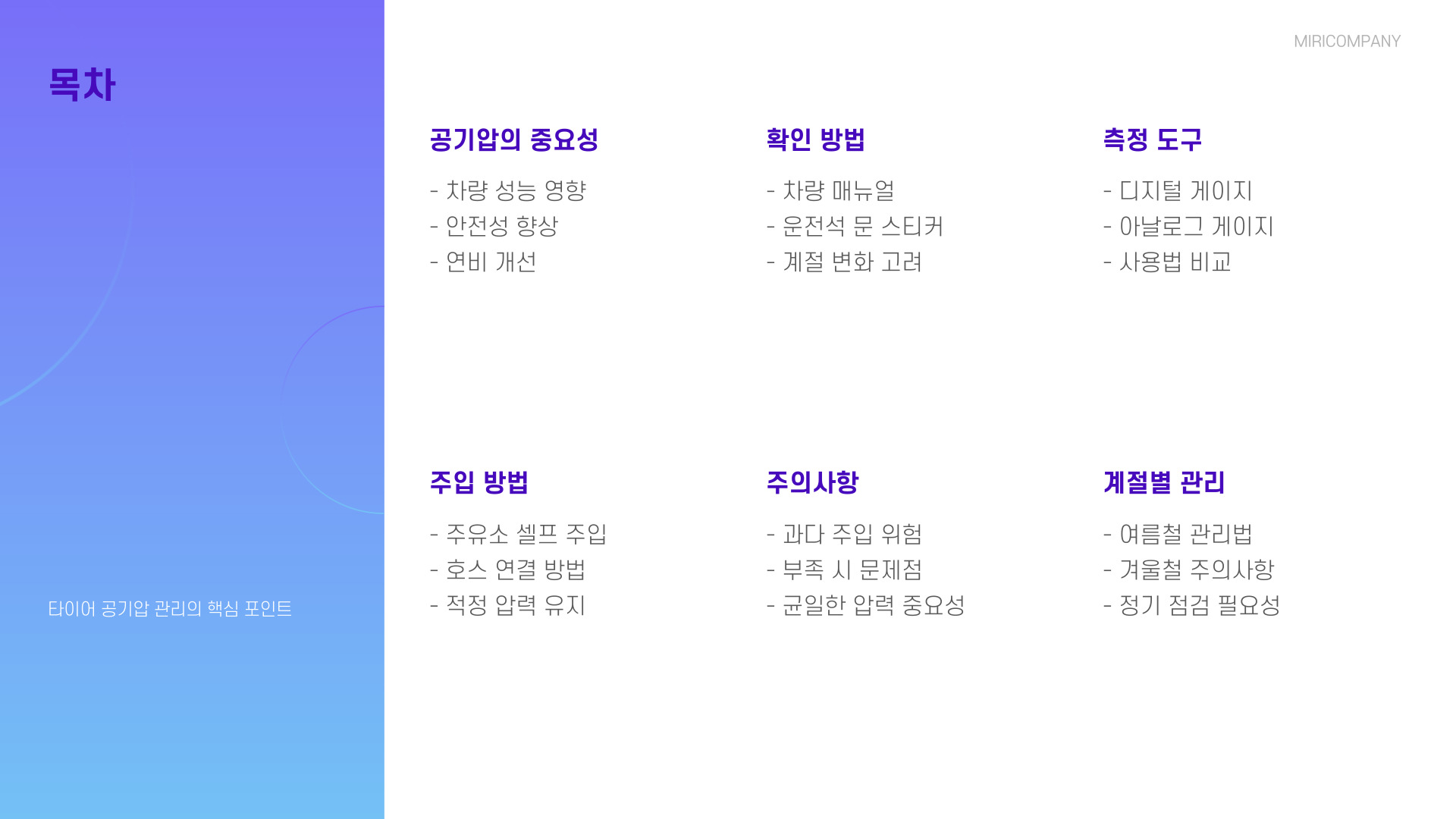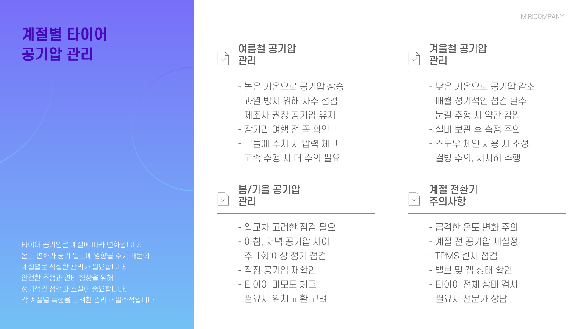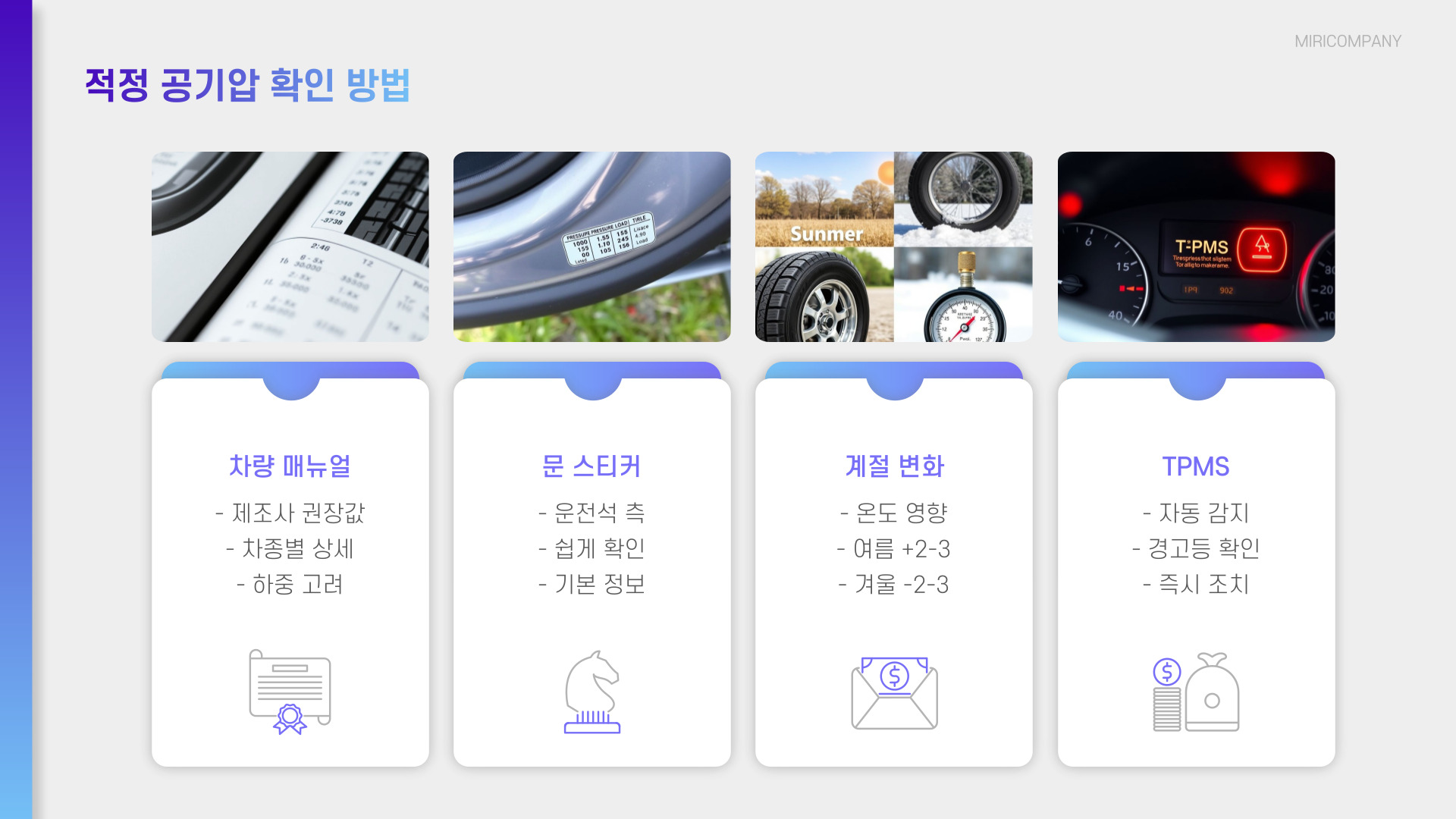 • 타이어 공기압은 차량 안전에 필수적입니다.