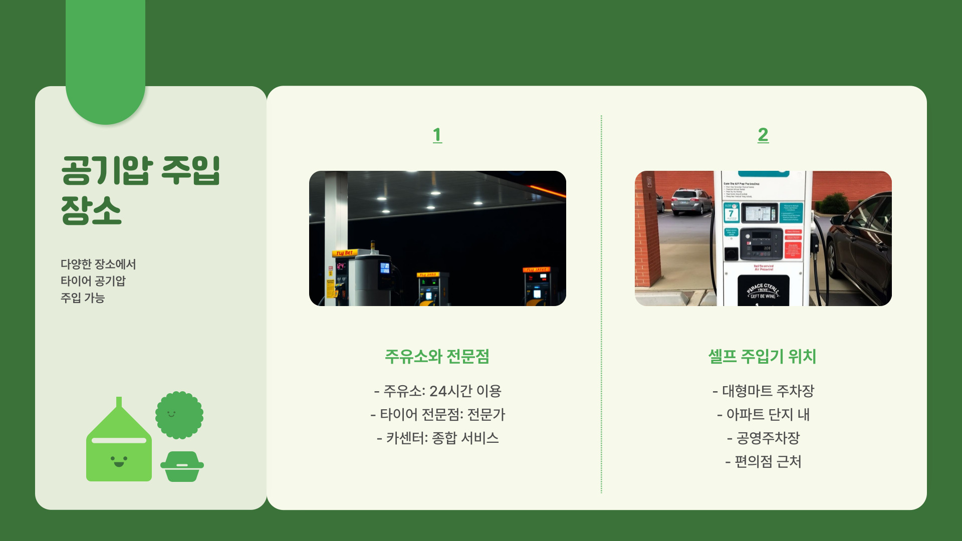 타이어 공기압을 쉽게 조정할 수 있는 장소는 매우 다양합니다. 주유소, 자동차 정비소, 그리고 대형 마트의 자동차 액세서리 코너 등에서 공기압을 넣을 수 있습니다. 요즘에는 공기압 조정기가 자동화되어 편리하게 이용할 수 있는 장소도 많습니다. 예를 들어, 주유소에 있는 공기압 조정기는 기다리는 시간 없이 즉시 조정이 가능합니다.