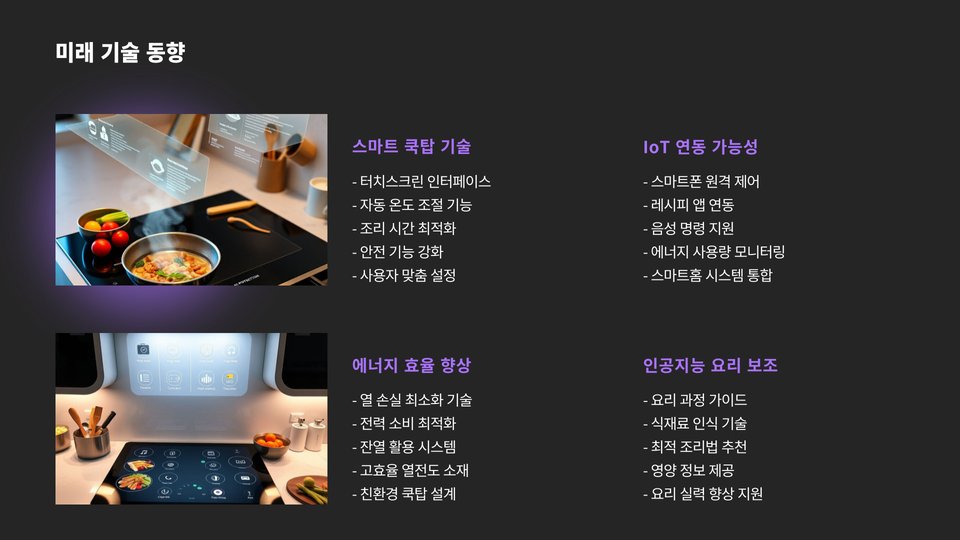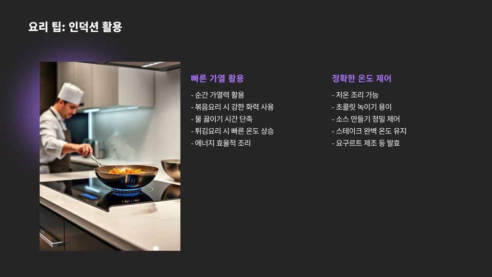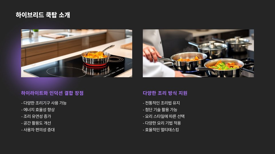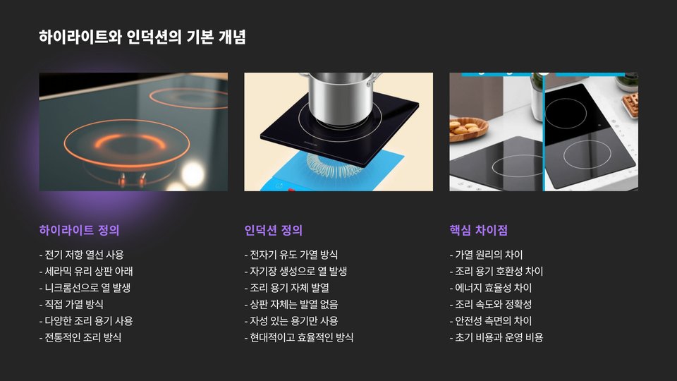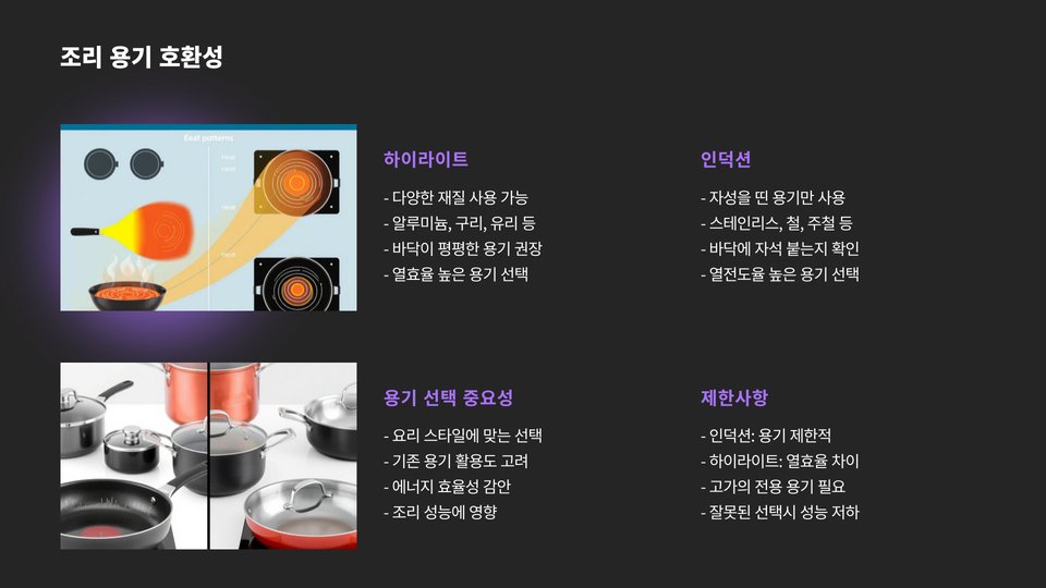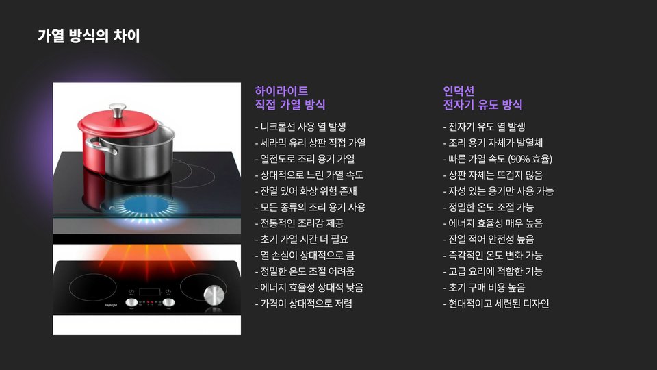 - 하이라이트 인덕션은 빠르고 효율적인 조리 방식입니다.