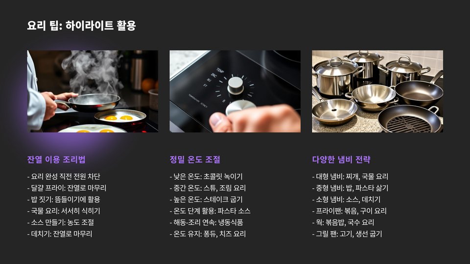 하이라이트 인덕션을 사용할 때는 몇 가지 유용한 팁이 있습니다. 첫째, 적절한 온도로 시작하는 것이 중요합니다. 처음에는 중간 온도에서 시작하여 조절하는 것이 좋습니다. 둘째, 냄비의 크기를 조절하여 열 손실을 최소화하세요. 마지막으로, 요리 후 바로 세척하지 말고, 온도가 식을 때까지 기다리는 것이 좋습니다. 이렇게 하면 냄비의 내구성을 높일 수 있습니다.