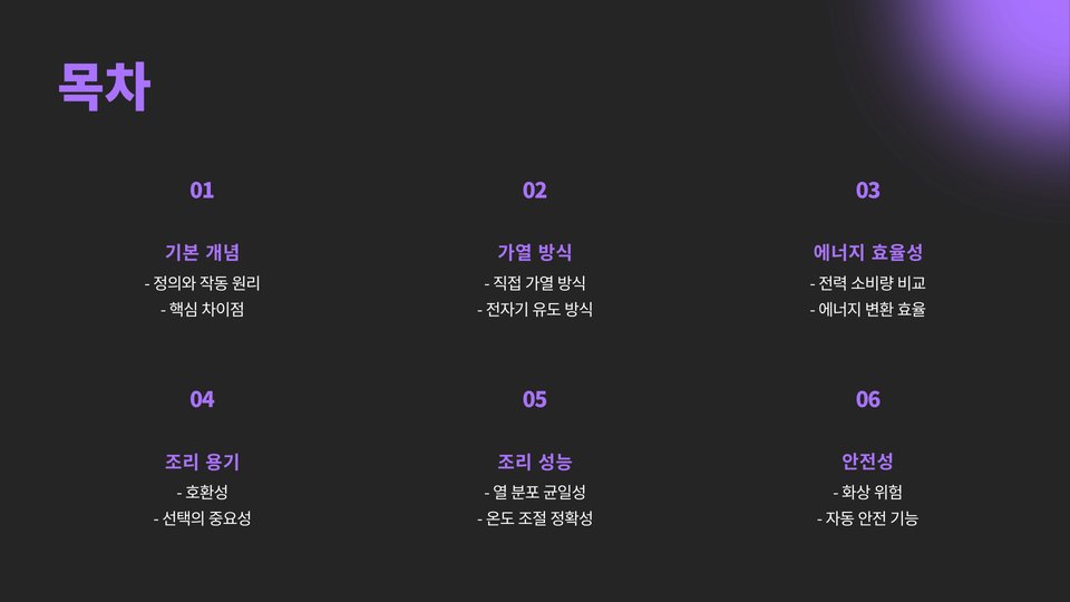 | 작동 원리 | 자기 유도 방식으로 직접 가열 | 전기 저항열 방식으로 상판 가열 |