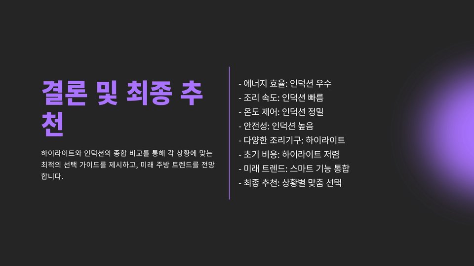 결론적으로, 인덕션과 하이라이트는 각각 장단점이 있으며, 선택은 개인의 요리 스타일과 필요에 따라 달라질 수 있습니다. 인덕션은 빠른 가열 속도와 안전성 면에서 우수한 반면, 하이라이트는 보편적으로 사용 가능한 경량성과 가격적인 큰 장점을 가지고 있습니다.