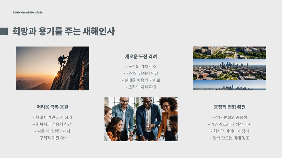 이 인사말은 사람들에게 내면의 잠재력을 믿고 도전하도록 격려하는 힘이 있습니다. 친구 또는 동료가 무엇을 이루고자 하는지를 생각하며, 그들에게 긍정적인 에너지를 전달할 수 있습니다. '꿈과 희망'을 주제로 한 메시지는 서로가 함께 성장하는 데 큰 도움이 될 것입니다.