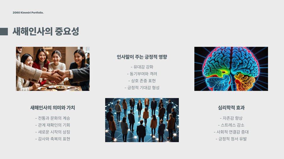 2025년을 맞이하며, “평화롭고 성숙한 한 해가 되길”이라는 인사말은 나름의 깊이가 있는 메시지입니다. 인사말에서 나타나는 '평화롭고 성숙한'이라는 표현은 현시대에 중요한 가치로, 앞으로 나아갈 길에서 서로가 더욱 성숙해지기를 기원하는 의미를 담고 있습니다.