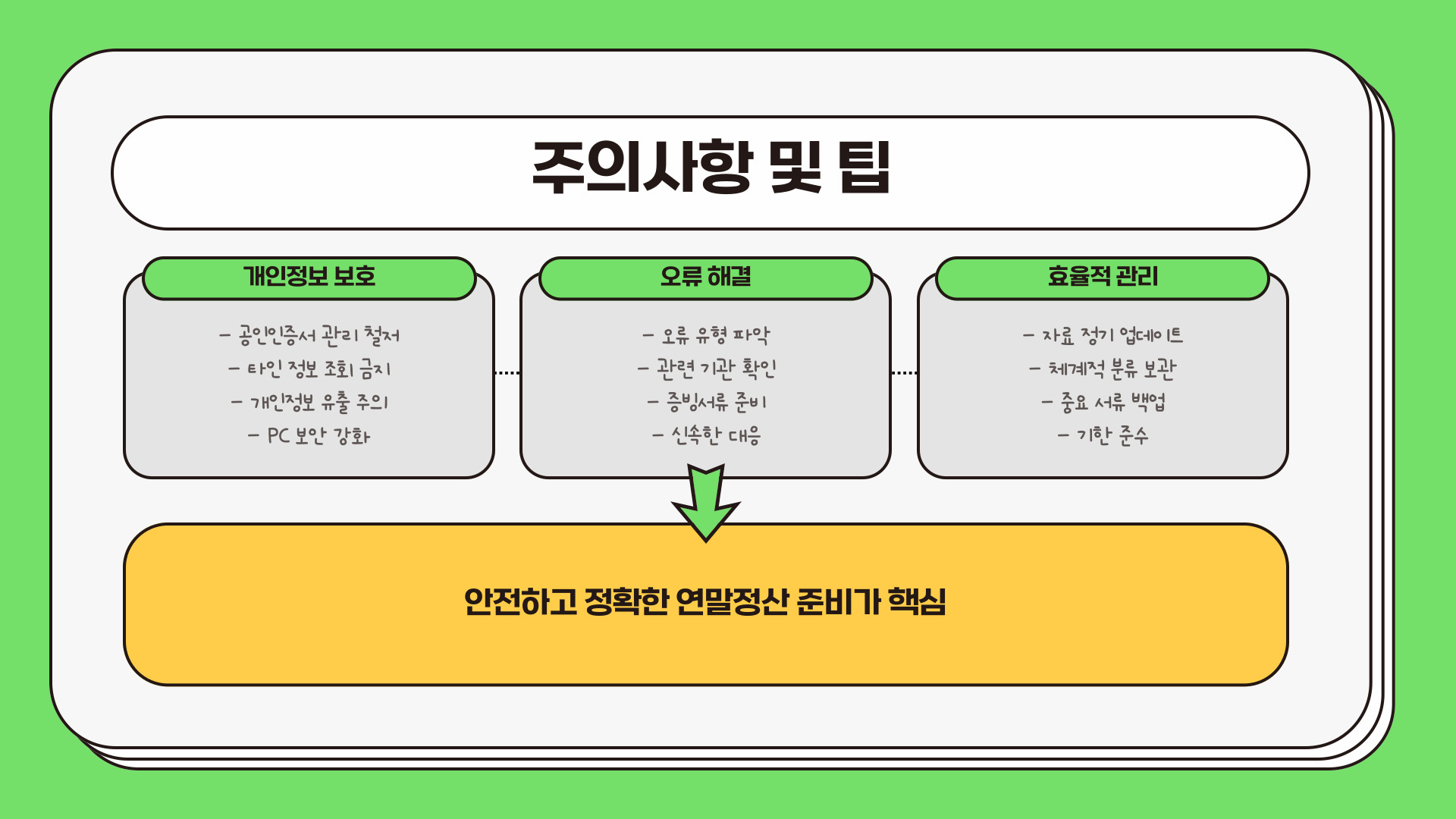 연말정산은 매년 반복되는 절차이기도 하므로, 매년 조금씩 준비하는 습관을 들이는 것이 중요합니다. 이를 통해 매년 스트레스를 줄이고, 정확한 세무 처리를 할 수 있습니다.