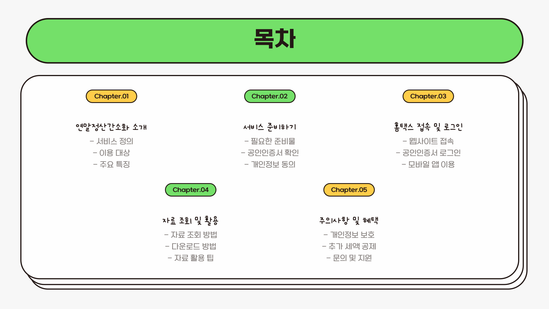 홈택스 연말정산 간소화 서비스는 세무 처리를 획기적으로 간편하게 만들어주는 도구입니다. 지금 시작하여 보다 나은 연말정산 경험을 누려보세요. 간편하고 정확한 세무 처리는 여러분의 소중한 시간을 아껴주고, 스트레스를 줄여줍니다. 연말정산을 준비하는 데 있어 홈택스는 여러분의 믿음직한 파트너가 될 것입니다.