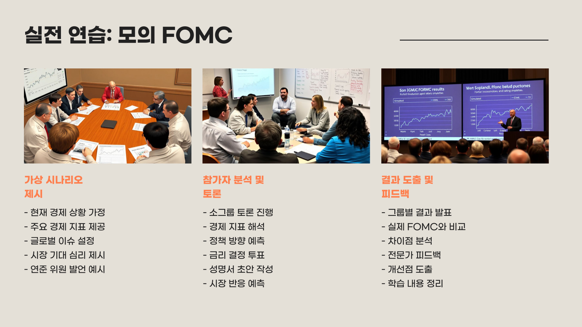 예를 들어, FOMC와 경제 지표에 대한 전문 서적을 읽거나, 관련 세미나에 참석하여 최신 정보를 얻는 것이 좋습니다. 온라인 강의 역시 다양한 전문가의 통찰을 제공하므로 유용하게 활용할 수 있습니다.