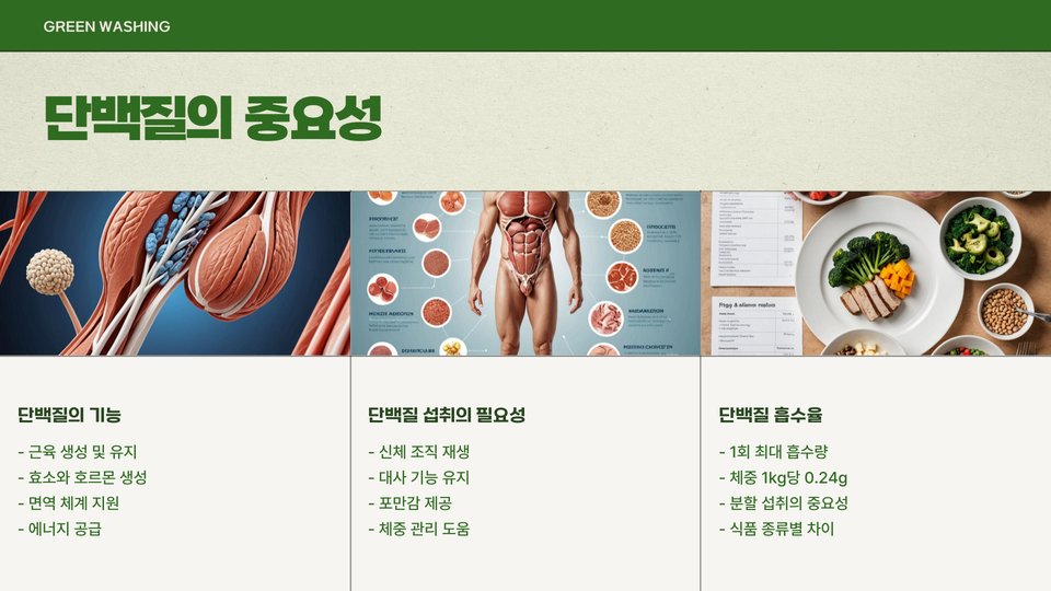 단백질은 우리 몸의 모든 세포에 존재하며, 특히 근육, 피부, 머리카락, 손톱 등을 구성하는 주요 성분입니다. 적절한 단백질 섭취는 건강한 체중 유지와 근육 성장에 필수적입니다. 최근 연구에 따르면, 성인은 체중 1kg당 약 0.8g의 단백질을 섭취해야 합니다. 그러나 운동을 많이 하거나 근육량을 늘리려는 경우, 이 수치는 1.2g에서 2.0g까지 증가할 수 있습니다.