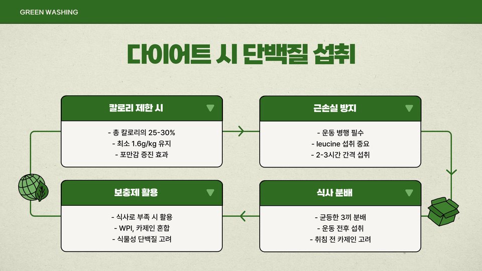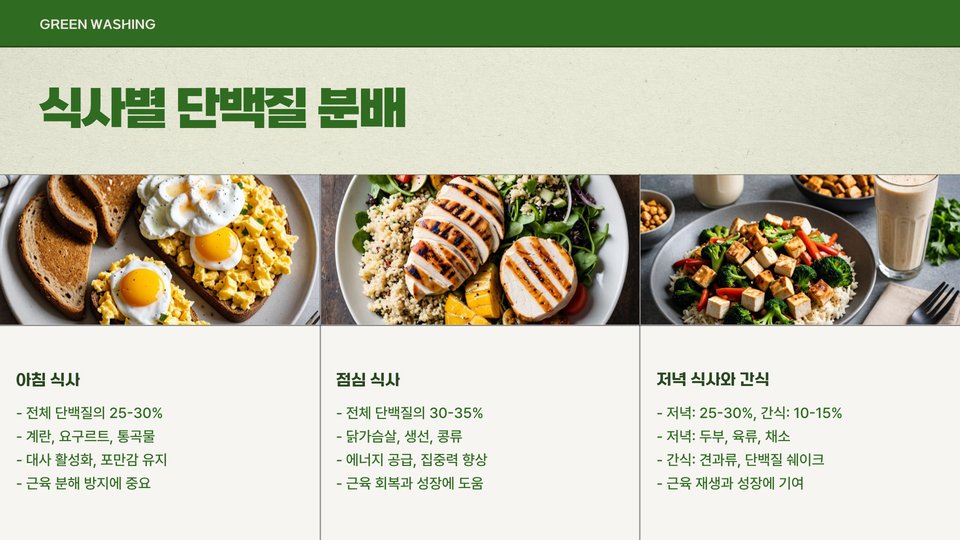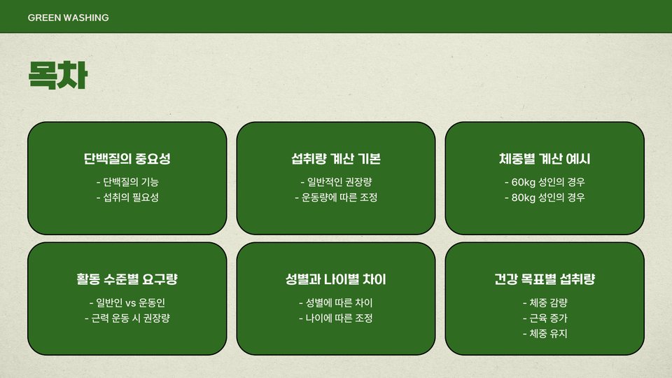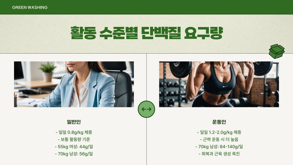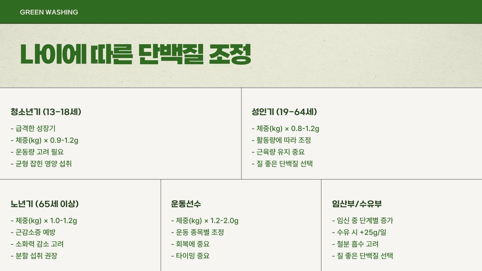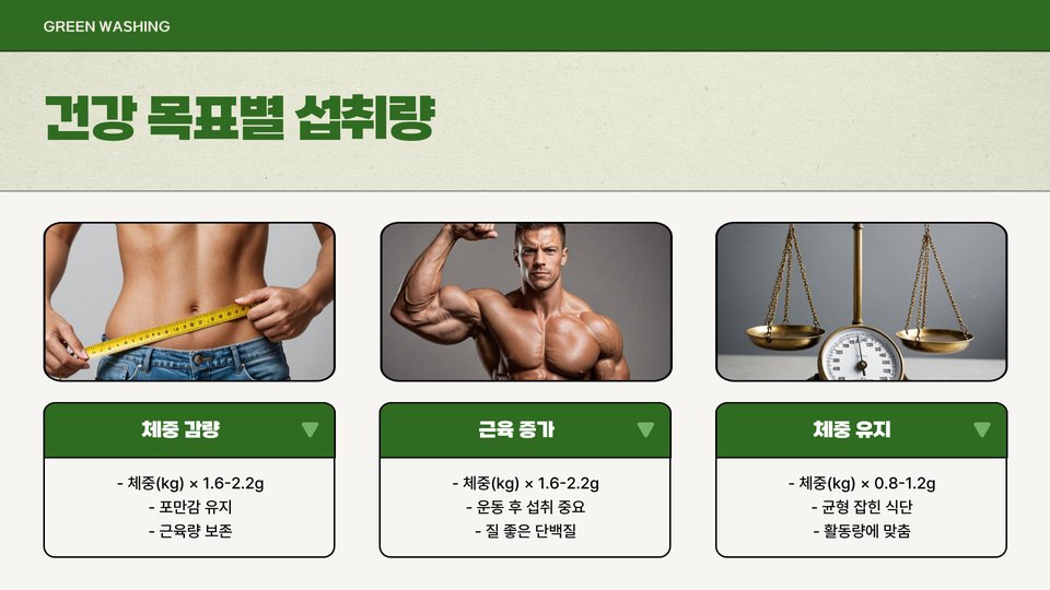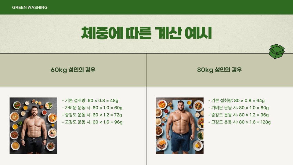 - 체중(kg) × 단백질 섭취 비율로 1일 단백질 필요량 계산.