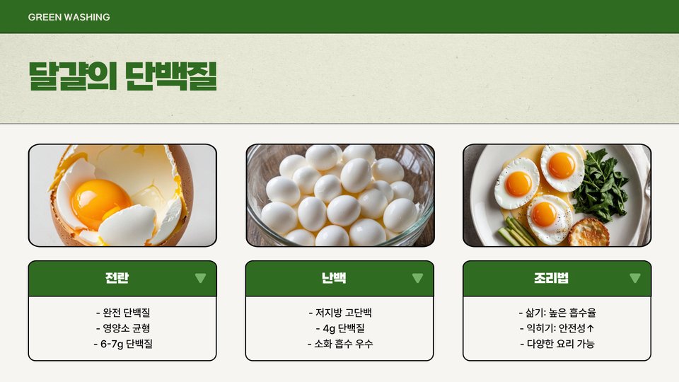 - 육류, 생선, 계란 및 식물성 단백질을 포함한 다양한 식품 선택.