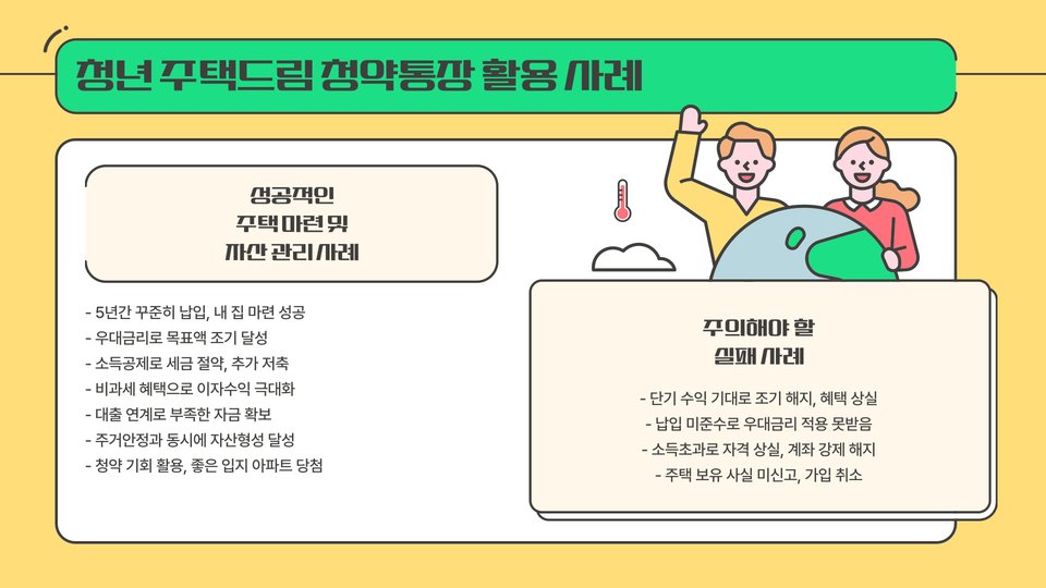 청약통장 가입 시 주의해야 할 사항도 있습니다. 첫째, 통장 해지 시 불이익이 있을 수 있으니 신중하게 결정해야 합니다. 또한, 청약통장은 장기 투자 상품이므로, 단기간에 돈을 찾는 것은 추천하지 않습니다. 둘째, 청약통장을 통해 주택을 구매한 이후에도 유지 관리에 대한 계획을 세워야 합니다. 이를 통해 주택 자산을 효과적으로 관리할 수 있습니다.