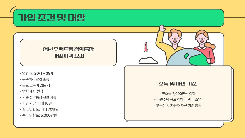 • 청년 주택드림 청약통장은 청년층을 위한 주택 구매 및 임대 지원 상품입니다.