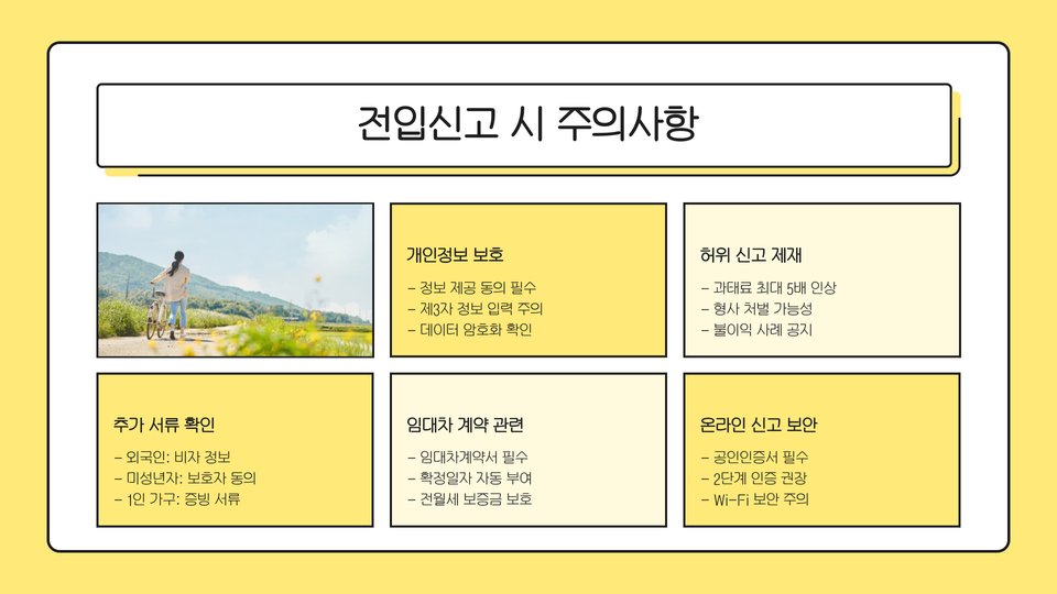 인터넷 전입신고를 진행할 때는 몇 가지 유의사항이 있습니다. 첫째, 신분증의 유효성을 반드시 확인해야 합니다. 둘째, 제출하는 서류가 정확하게 작성되어야 합니다. 잘못된 정보가 포함될 경우, 신고가 반려될 수 있습니다. 셋째, 신고 후에는 반드시 처리 결과를 확인해야 합니다. 처리 결과는 본인의 주민등록 상태에 큰 영향을 미치므로 소홀히 해서는 안 됩니다.