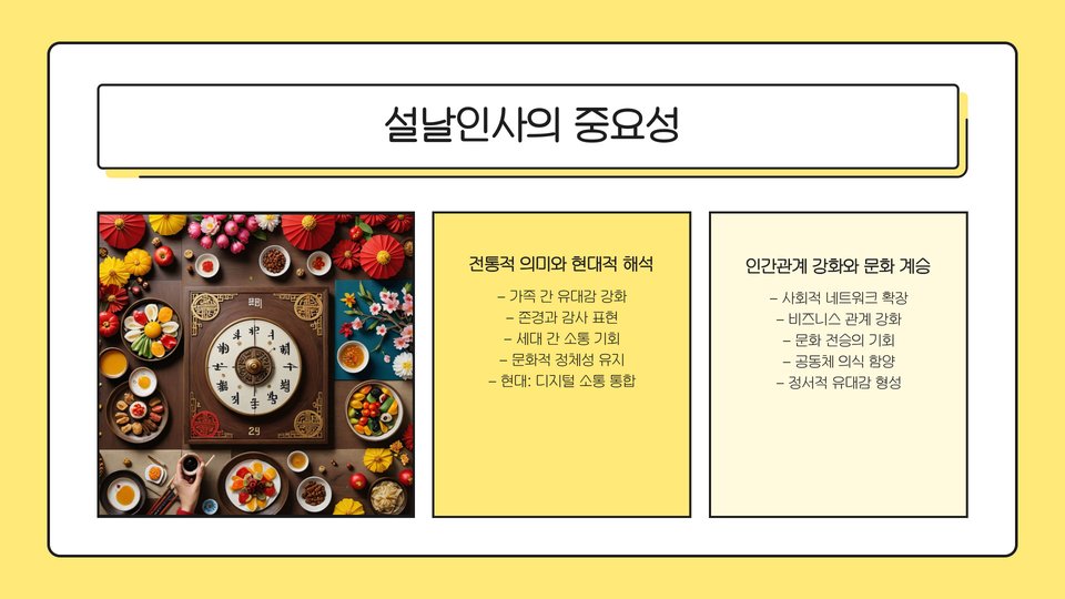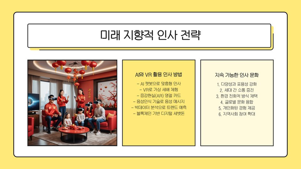 새해 인사는 단순한 의례가 아니라, 사람들 간의 유대감을 강화하고, 긍정적인 에너지를 전파하는 중요한 수단입니다. 설날 인사를 통해 우리는 서로의 건강과 행복을 기원하고, 관계를 더욱 깊게 만들어 나갈 수 있습니다. 또한, 이 인사는 새로운 한 해의 시작을 알리는 상징적인 의미를 가지고 있어, 사람들에게 희망과 기대감을 주는 역할을 합니다.