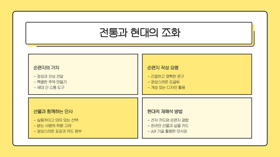 마지막으로, 선물을 함께 준비하는 것도 좋은 방법입니다. 소소한 선물과 함께 인사말을 전하면 받는 사람에게 깊은 인상을 줄 수 있습니다. 예를 들어, 전통적인 떡이나 차를 담아서 전하면 마음을 더욱 깊이 전할 수 있습니다. 인사말과 함께 작은 정성을 담은 선물을 전하는 것은 특별한 날을 더욱 기념하는 멋진 방법이 될 수 있습니다.