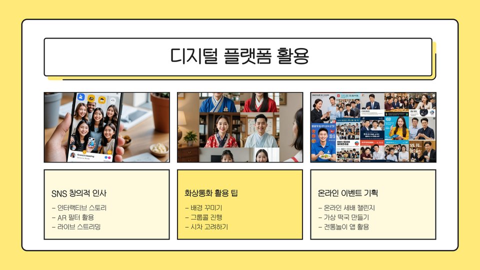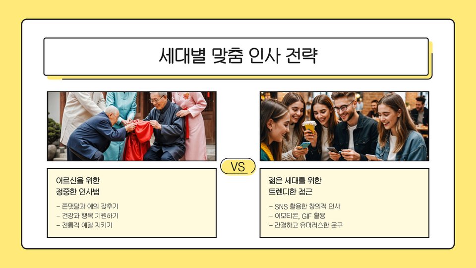 전통적인 인사말 외에도, 창의적인 방법으로 새해 인사를 전하는 것도 좋은 방법입니다. 예를 들어, SNS를 통해 짧은 동영상이나 GIF를 공유하는 것은 현대적인 트렌드에 부합하는 방법입니다. 또한, 카카오톡이나 문자 메시지를 통해 이모티콘이나 스티커를 사용하여 재미를 더할 수도 있습니다.