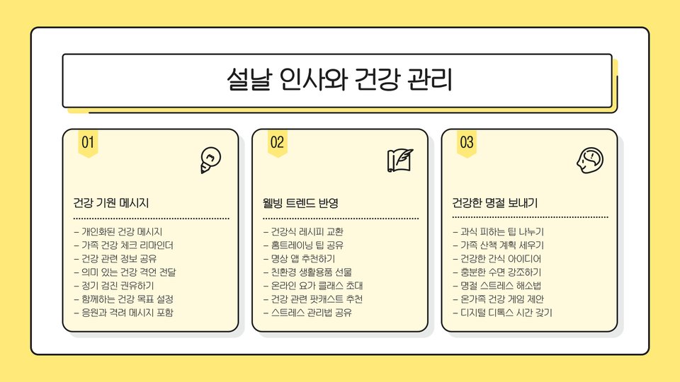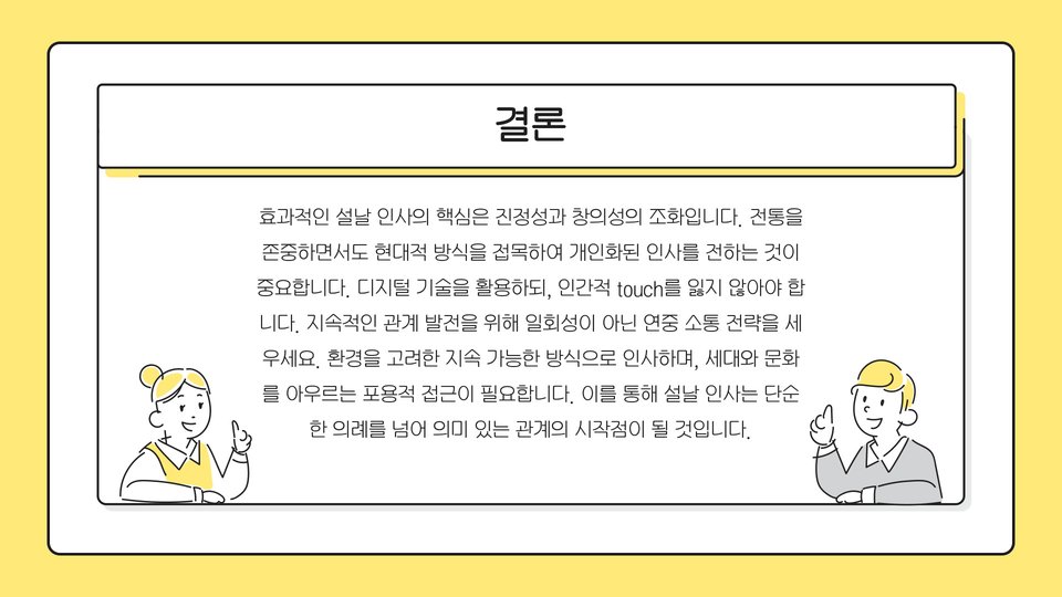 이러한 맥락에서 인사말을 전하는 것은 다가오는 한 해의 기운을 가져오는 데 중요한 역할을 합니다. 우리가 전하는 인사 한 마디가 소중한 관계를 더욱 견고히 하고, 긍정적인 에너지를 주고 받을 수 있기 때문입니다. 그러므로 2025년 설날에는 정성을 담아 진심 어린 인사를 전하는 것이 중요합니다.
