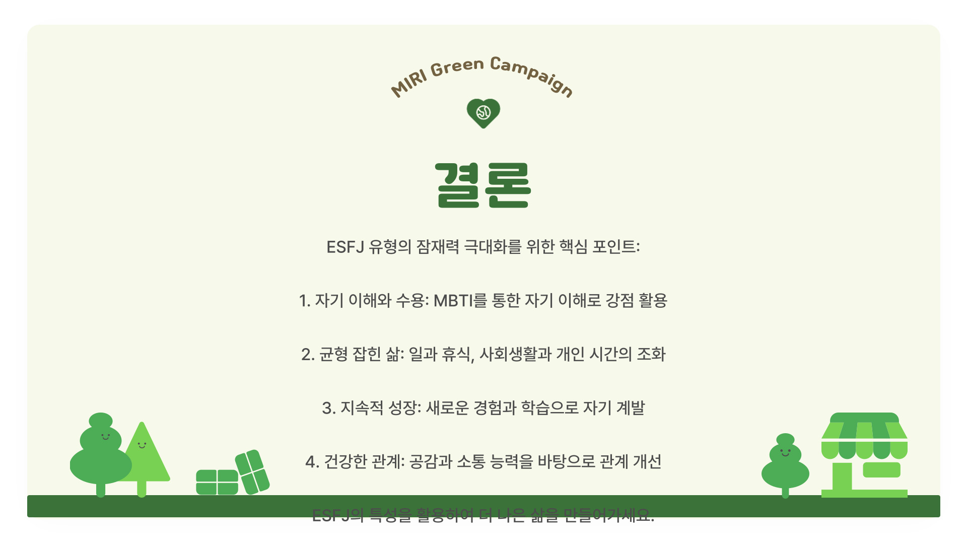 결론적으로, ESFJ는 사람들을 돕고 함께하는 것을 즐기는 만큼, 자신도 배려하는 것이 필요합니다. ESFJ의 고유한 특성을 이해하고, 이를 바탕으로 삶을 좀 더 풍요롭게 만들어가는 방법을 알아가는 것이 중요합니다. 오늘부터 시작하는 꿀팁을 통해 자신과 주변 모두에게 긍정적인 영향을 미쳐 보세요!
