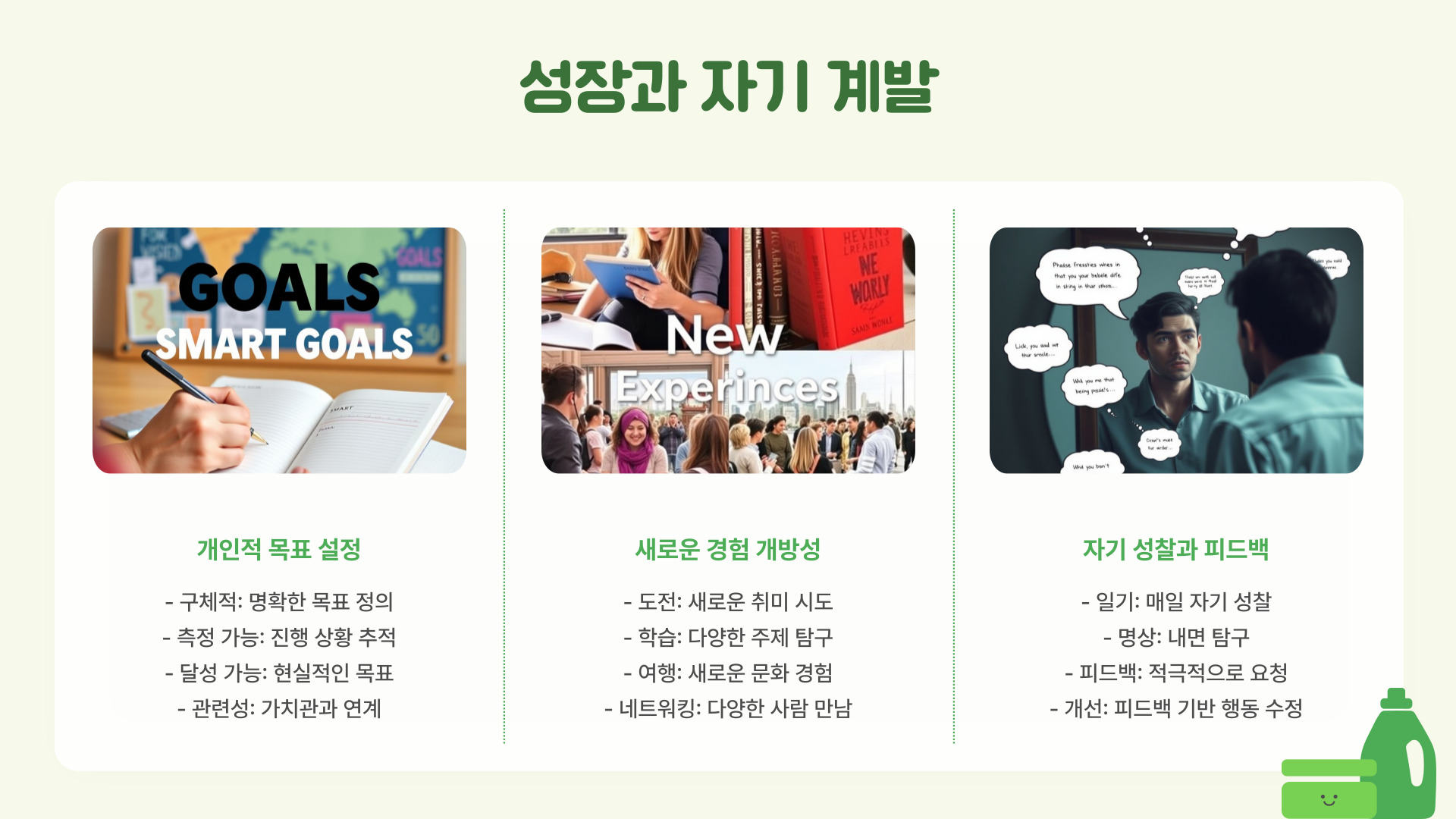 | 목표 설정 | 구체적이고 현실적인 목표를 세워 성취감 증가 |