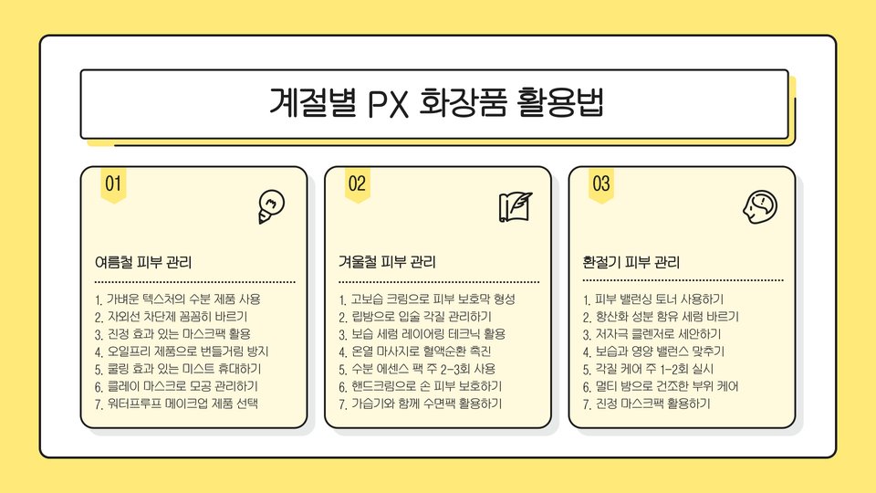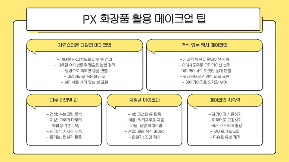px 화장품을 사용할 때는 몇 가지 점을 유의해야 합니다. 첫째, 자신의 피부 타입에 맞는 제품을 선택하는 것이 중요합니다. 예를 들어, 지성 피부라면 오일 프리 제품을, 건성 피부라면 수분을 공급하는 제품을 선택해야 합니다. 둘째, 사용 전 패치 테스트를 통해 알레르기 반응을 확인하는 것이 좋습니다. 마지막으로, 정기적인 사용을 통해 제품의 효과를 극대화할 수 있습니다.