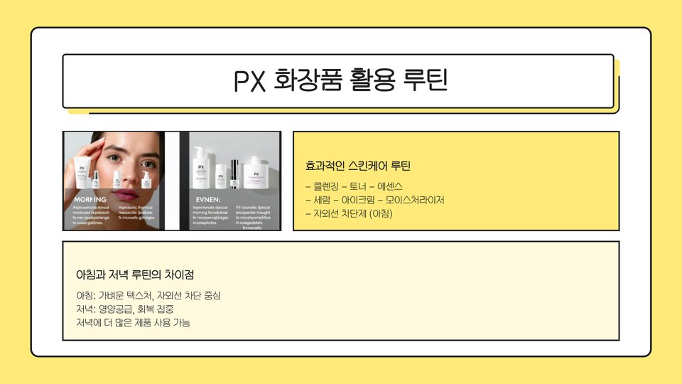 마지막으로, px 화장품의 기초가 되는 원리와 특징을 이해하고 다양한 제품을 시도해 보면서 자신만의 뷰티 루틴을 만드는 것이 큰 도움이 될 것입니다. 과학적 근거에 기반한 제품들이 늘어나고 있는 만큼, 자신에게 맞는 제품을 선택하여 효과를 극대화할 수 있기를 바랍니다.