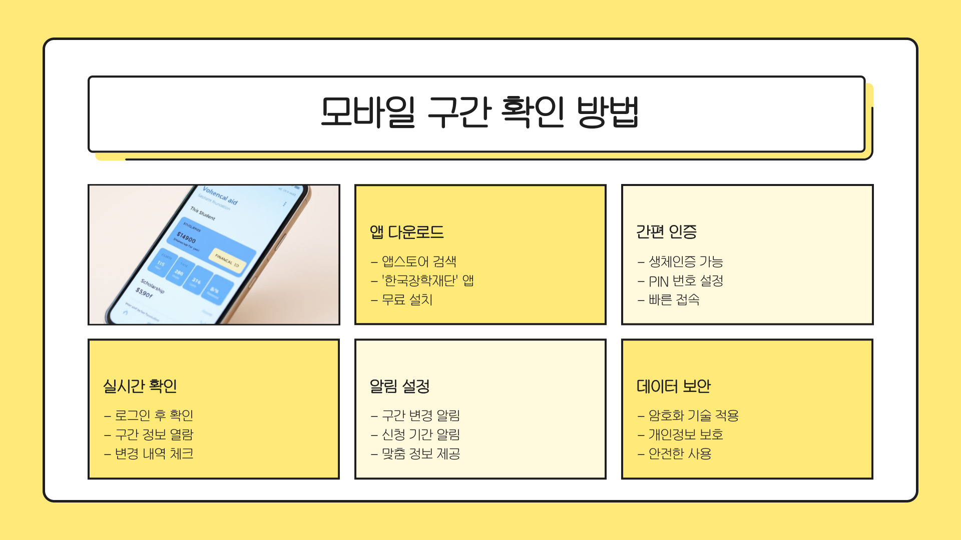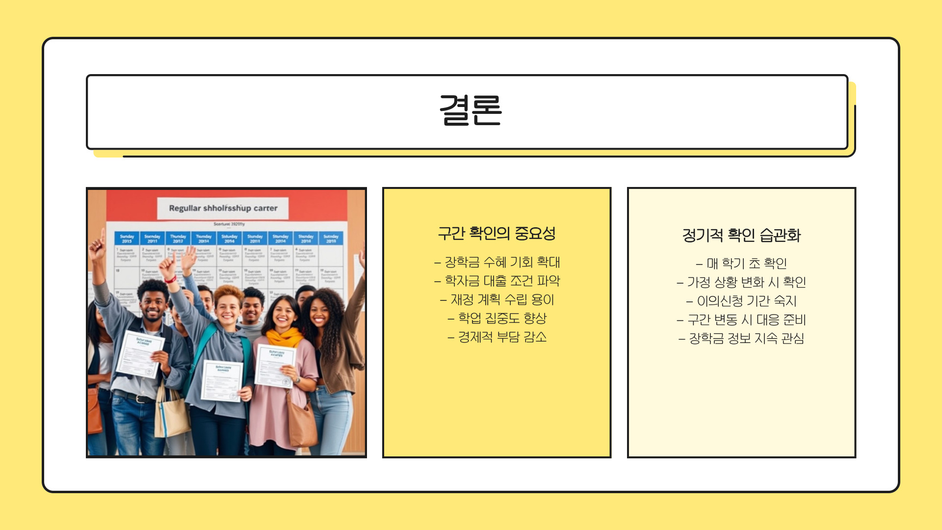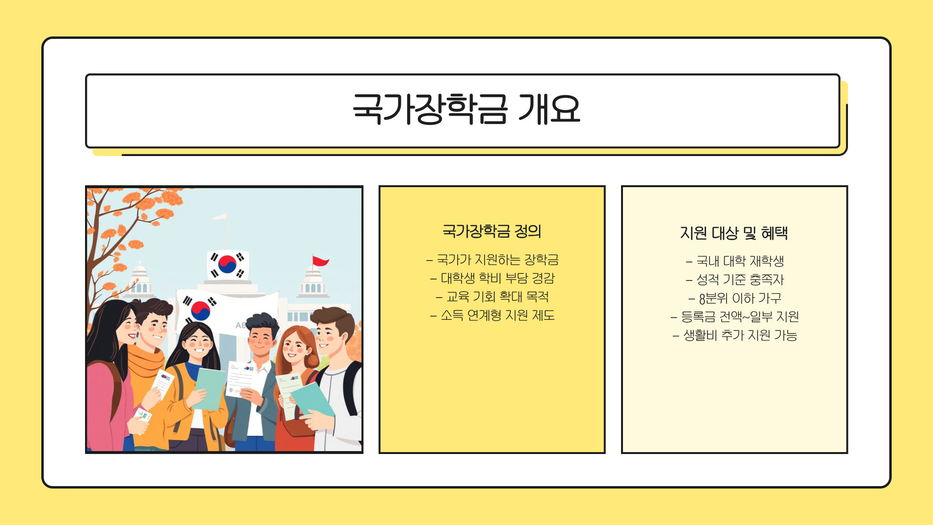 - 국가장학금은 경제적 지원 프로그램이며, 구간 확인이 중요하다.