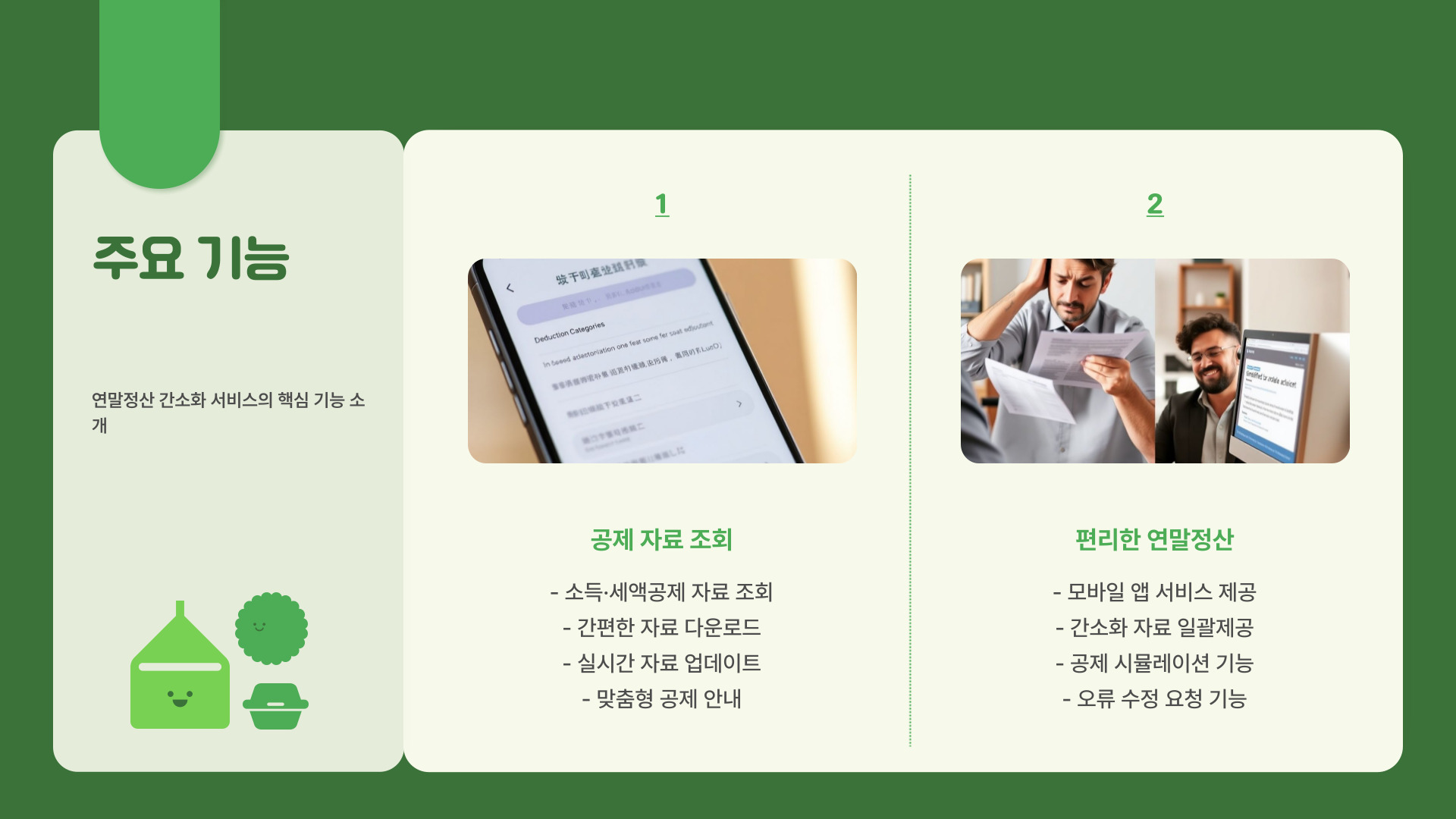 이 서비스는 여러 가지 장점을 제공합니다. 첫째, 시간 절약이 가능합니다. 모든 자료가 자동으로 수집되므로 근로자가 직접 자료를 찾거나 정리하는 데 소모되는 시간을 크게 줄일 수 있습니다. 둘째, 스트레스 감소를 도와줍니다. 복잡한 세금 정산 과정을 간소화하여 심리적인 부담을 덜 수 있습니다. 마지막으로, 정확성 향상을 통해 자료 누락이나 오류를 줄일 수 있습니다.