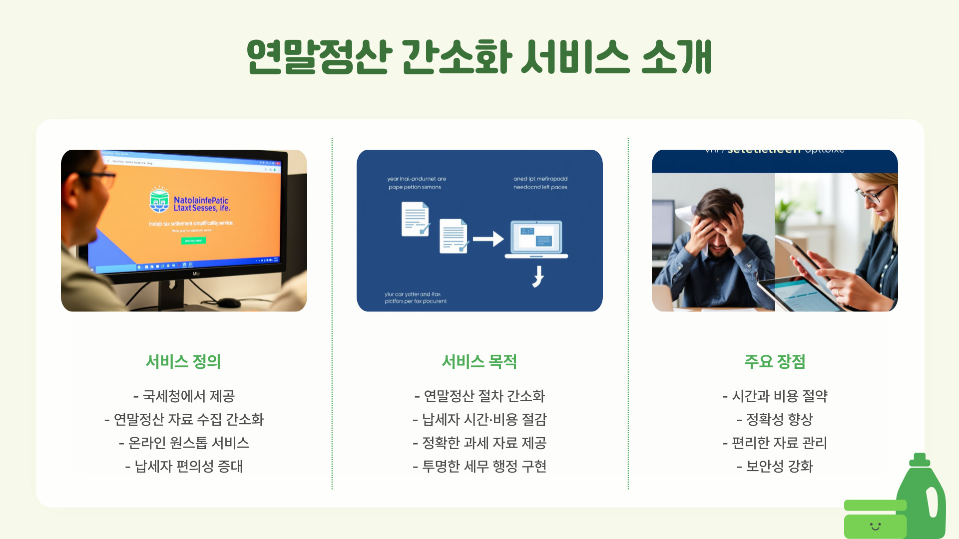 연말정산은 매년 많은 근로자들에게 큰 스트레스를 주는 과정입니다. 하지만 국세청의 연말정산 간소화 서비스를 이용하면 이 과정을 훨씬 쉽게 해결할 수 있습니다. 이 서비스는 근로자들이 세금 정산을 보다 수월하게 할 수 있도록 도와주며, 필요한 자료를 자동으로 수집해주는 기능을 갖추고 있습니다. 아래에서는 이 서비스의 개요와 이용 방법, 그리고 유용한 팁을 자세히 살펴보겠습니다.