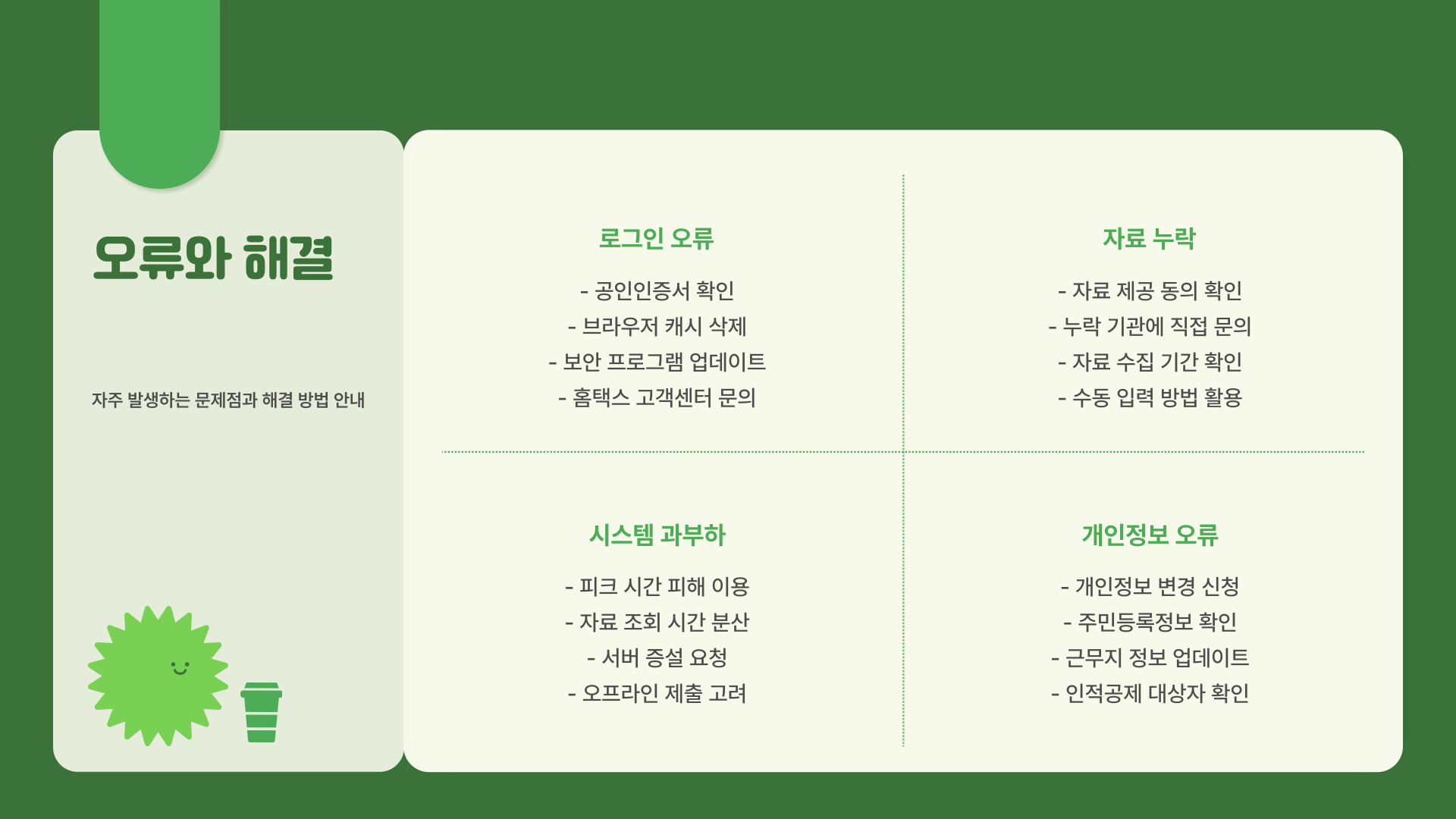 마지막으로, 서비스 사용 중 문제가 발생할 경우에는 국세청에 문의하기 하는 것이 최선의 선택입니다. 고객센터를 통해 필요한 정보를 받을 수 있으며, 복잡한 문제도 쉽게 해결할 수 있습니다.