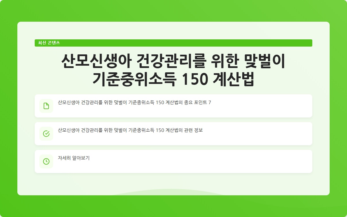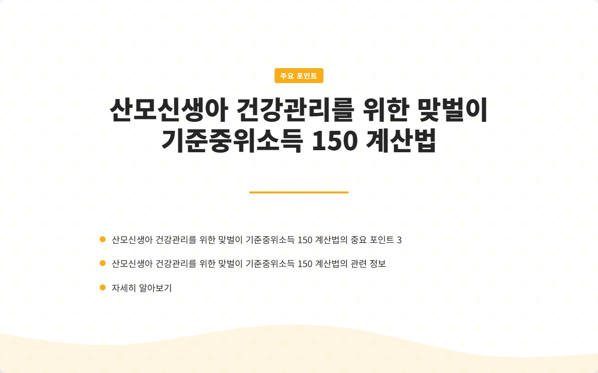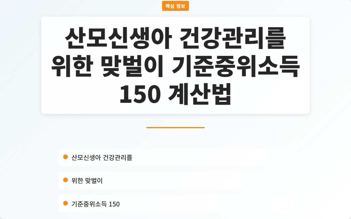 출산 후 산모와 신생아의 건강관리는 매우 중요합니다. 그러나 맞벌이를 하는 가정에서는 경제적 여건도 고려해야 합니다. 특히 기준중위소득 150%을 기준으로 하여 지원 혜택을 받을 수 있는 조건을 이해하는 것이 필수적입니다. 이 글에서는 기준중위소득 150%의 개념과 이를 계산하는 방법을 자세히 알아보겠습니다.