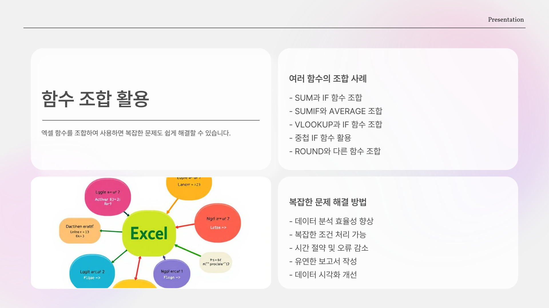 - SUM, AVERAGE, IF와 같은 함수는 업무 효율성을 높입니다.