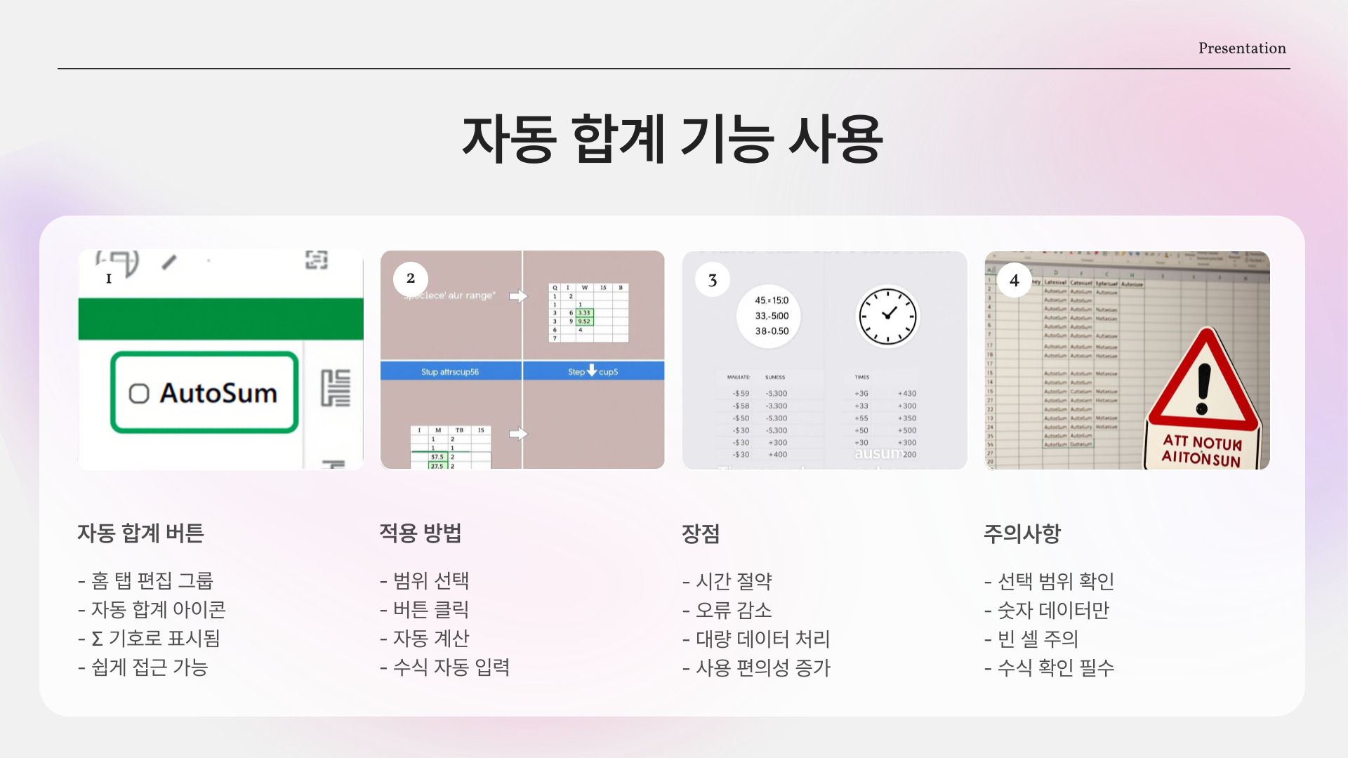 | 자동 합계 | 선택한 범위의 합계를 자동으로 계산 |
