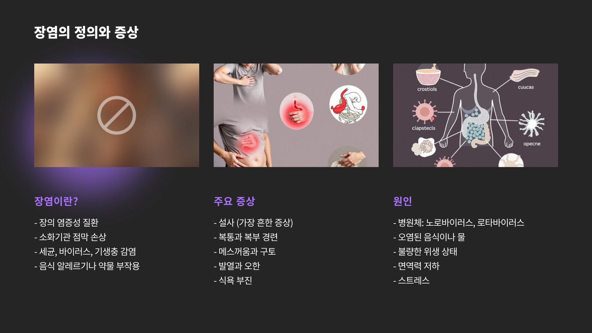 장염은 여러 가지 원인으로 발생할 수 있습니다. 주로 바이러스나 세균 감염이 주요 원인으로 알려져 있으며, 오염된 음식이나 물을 통해 전염될 수 있습니다. 대표적인 증상으로는 복통, 설사, 구토가 있습니다. 이러한 증상은 급격하게 나타날 수 있으며, 환자의 상태에 따라 심각성을 다르게 느낄 수 있습니다. 특히, 어린이나 노인의 경우에는 탈수 증상이 우려되므로 더욱 주의가 필요합니다.
