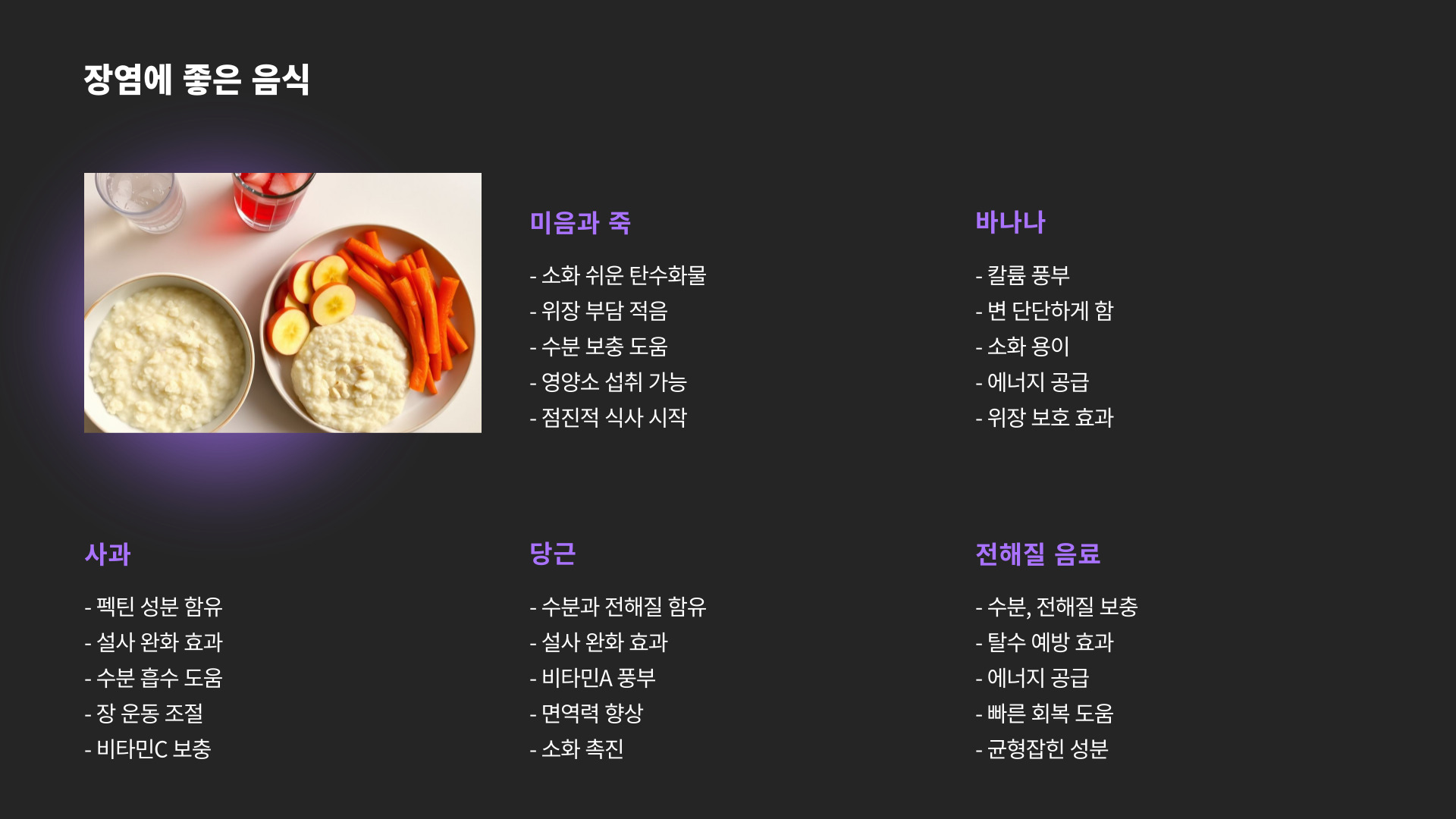 또한, 가벼운 식사가 필요합니다. 소화가 잘 되는 이유식이나 바나나, 쌀과 같은 저자극 음식을 선택하여 섭취하는 것이 좋습니다. 기름진 음식이나 자극적인 음식은 피해야 합니다.