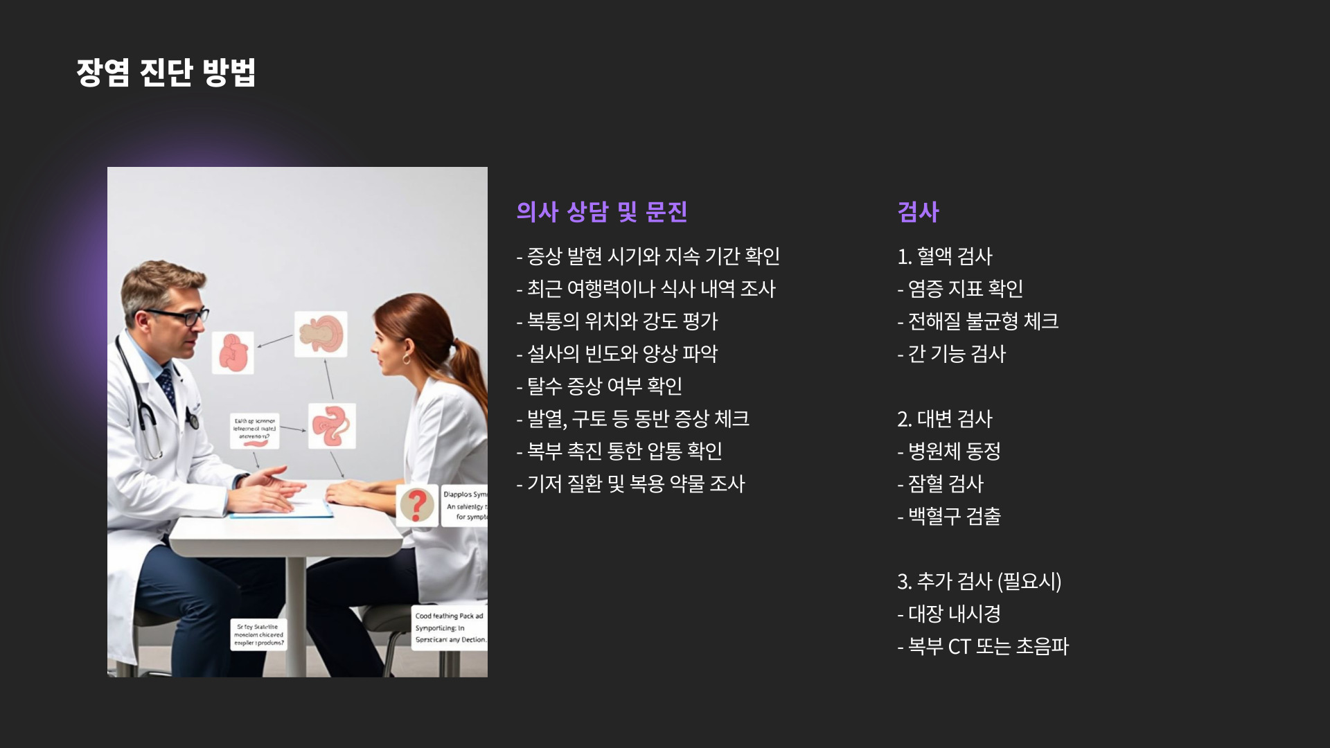 마지막으로, 정기적인 건강 검진을 통해 자신의 건강 상태를 체크하는 것이 좋습니다. 장염은 때때로 다른 질병의 신호일 수도 있으니, 주의해야 합니다.