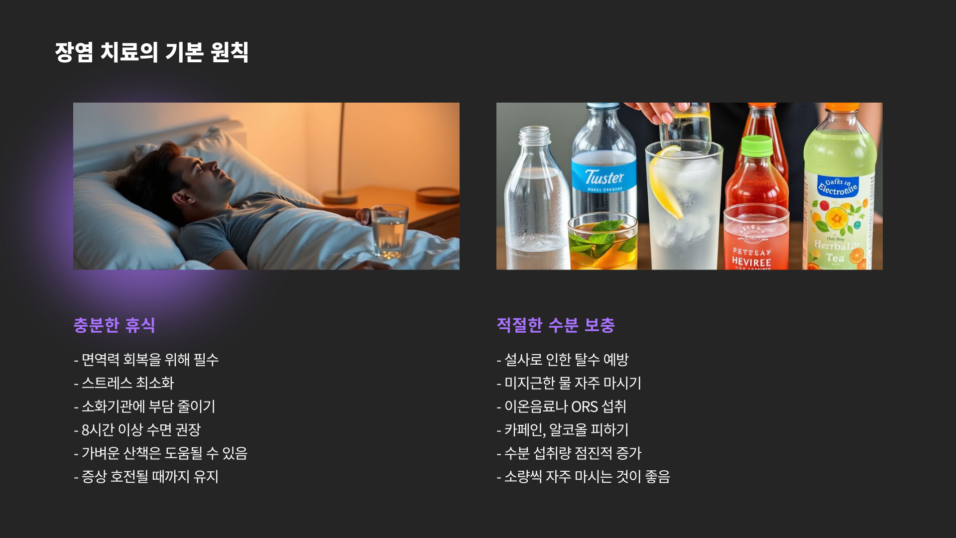 장염을 빨리 낫게 하기 위해서는 먼저 수분 보충이 중요합니다. 탈수를 예방하기 위해 충분한 물을 마시고, 필요한 경우 이온음료를 섭취하는 것이 좋습니다. 이온음료는 전해질을 보충해주어 장염으로 인한 피로감 회복에 도움이 됩니다.